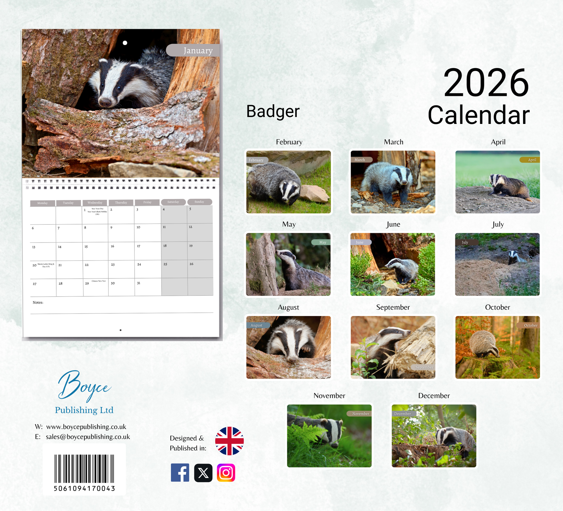 Each page features a vibrant, full-color Badger images paired with a spacious monthly grid for notes and appointments. Brightens your kitchen, living room, office, or classroom with elegant charm.