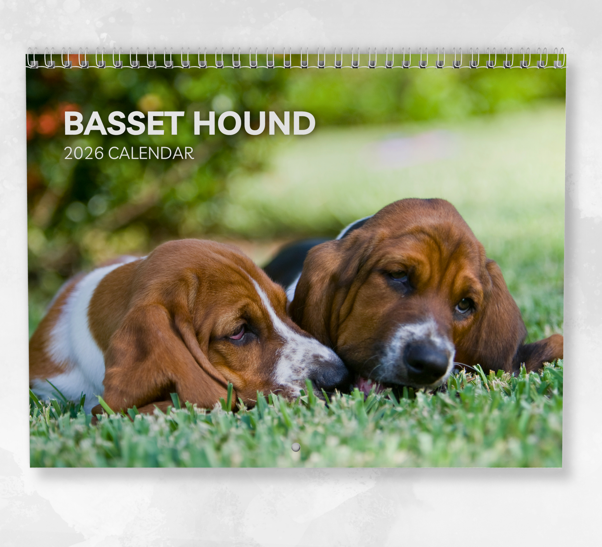 Stay organized with this beautiful 2026 Basset Hound wall calendar. (Jan–Dec 2026).