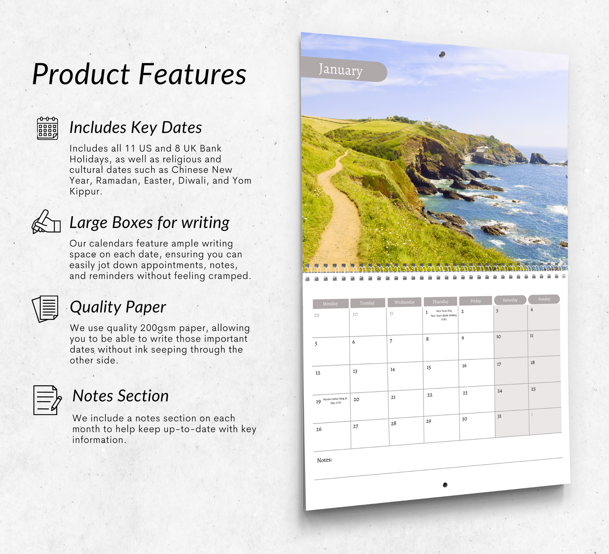Each page features a vibrant, full-color British Landscapes images paired with a spacious monthly grid for notes and appointments. Brightens your kitchen, living room, office, or classroom with elegant charm.