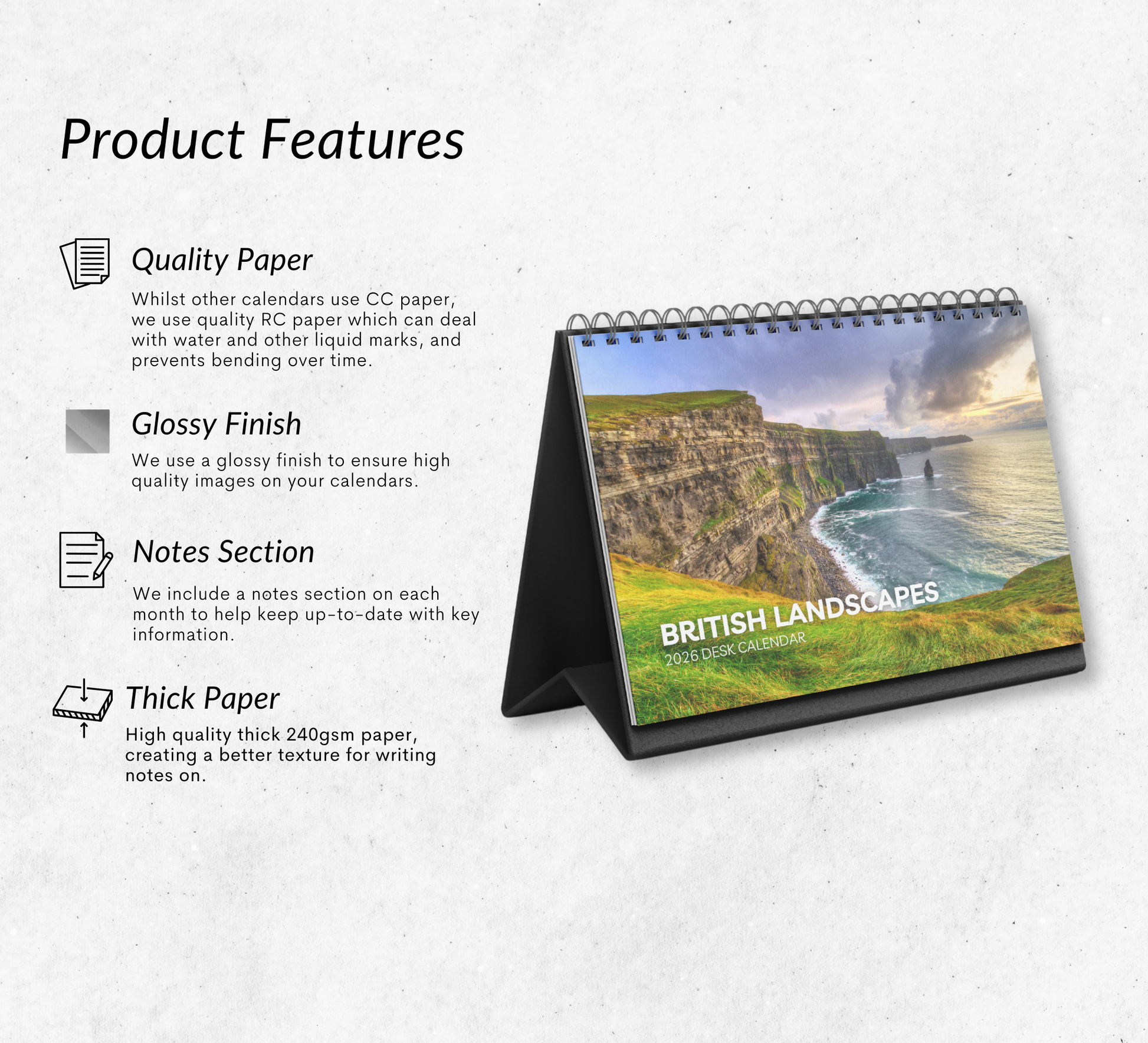 Keep your schedule on track with this beautiful 2026 British Landscapes desk calendar. Featuring ample space for notes, appointments, and reminders, each month is thoughtfully designed to help you stay organized with ease.