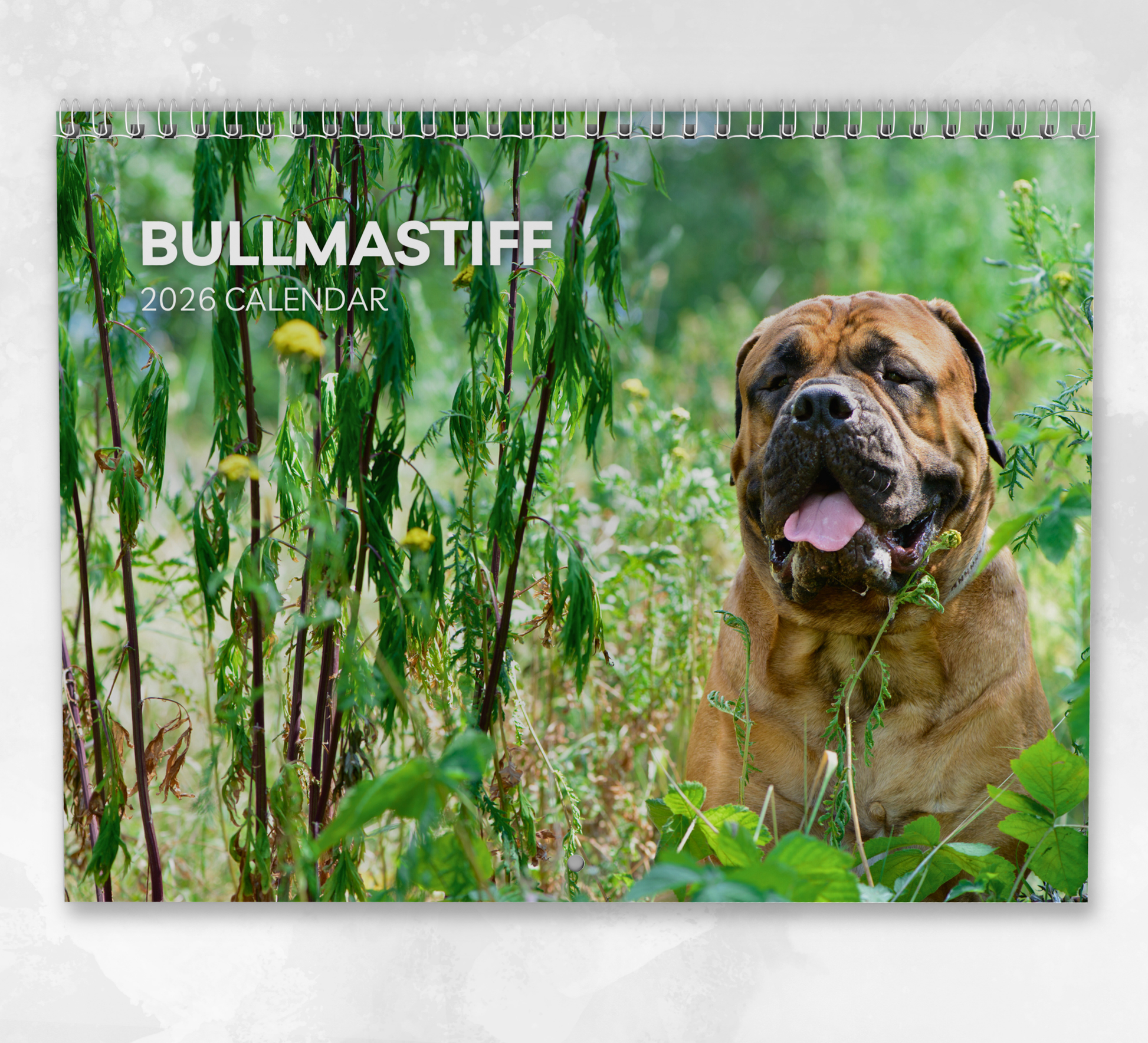 Stay organized with this beautiful 2026 Bullmastiff wall calendar. (Jan–Dec 2026).