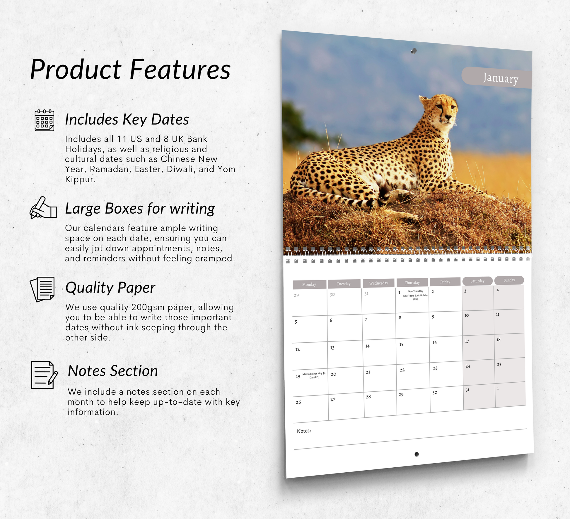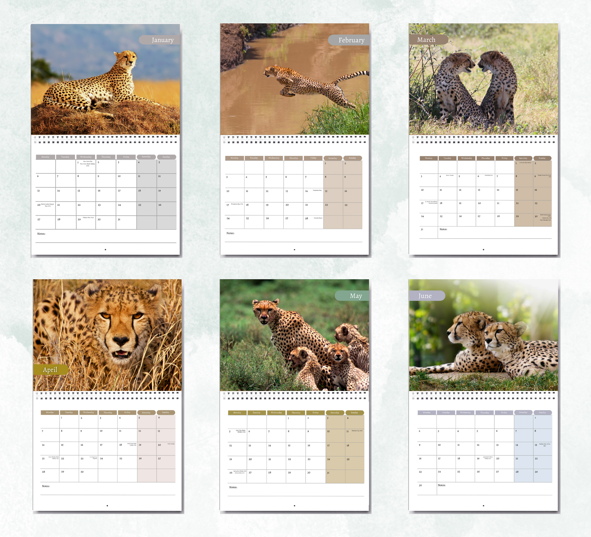 Each page features a vibrant, full-color Cheetah images paired with a spacious monthly grid for notes and appointments. Brightens your kitchen, living room, office, or classroom with elegant charm.