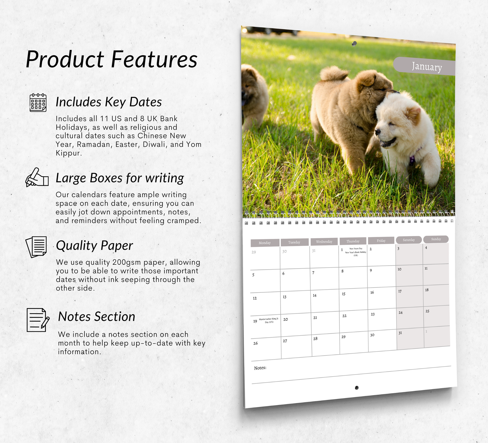 Each page features a vibrant, full-color Chow Chow images paired with a spacious monthly grid for notes and appointments. Brightens your kitchen, living room, office, or classroom with elegant charm.
