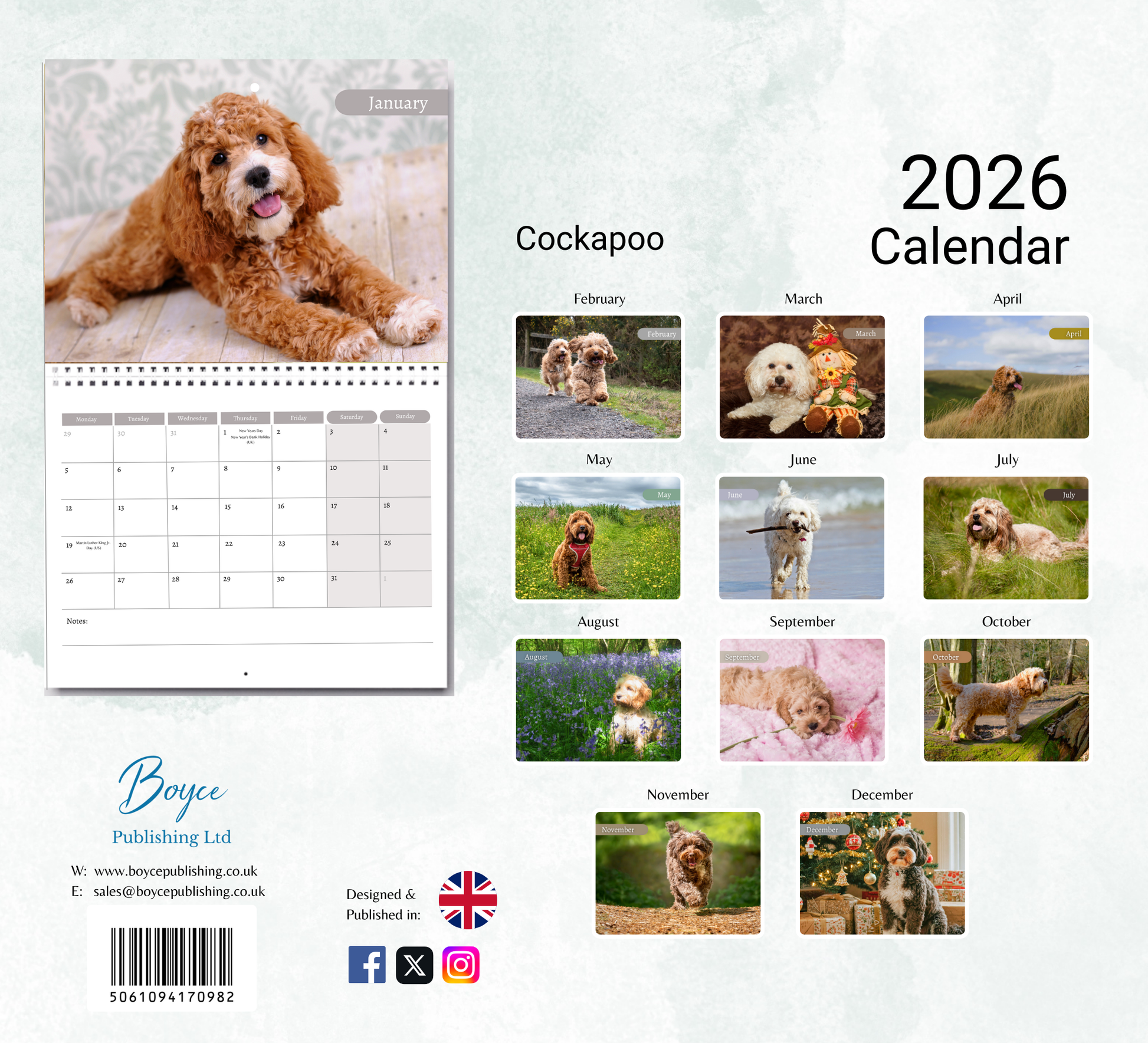 Stay organized with this beautiful 2026 Cockapoo wall calendar. (Jan–Dec 2026).