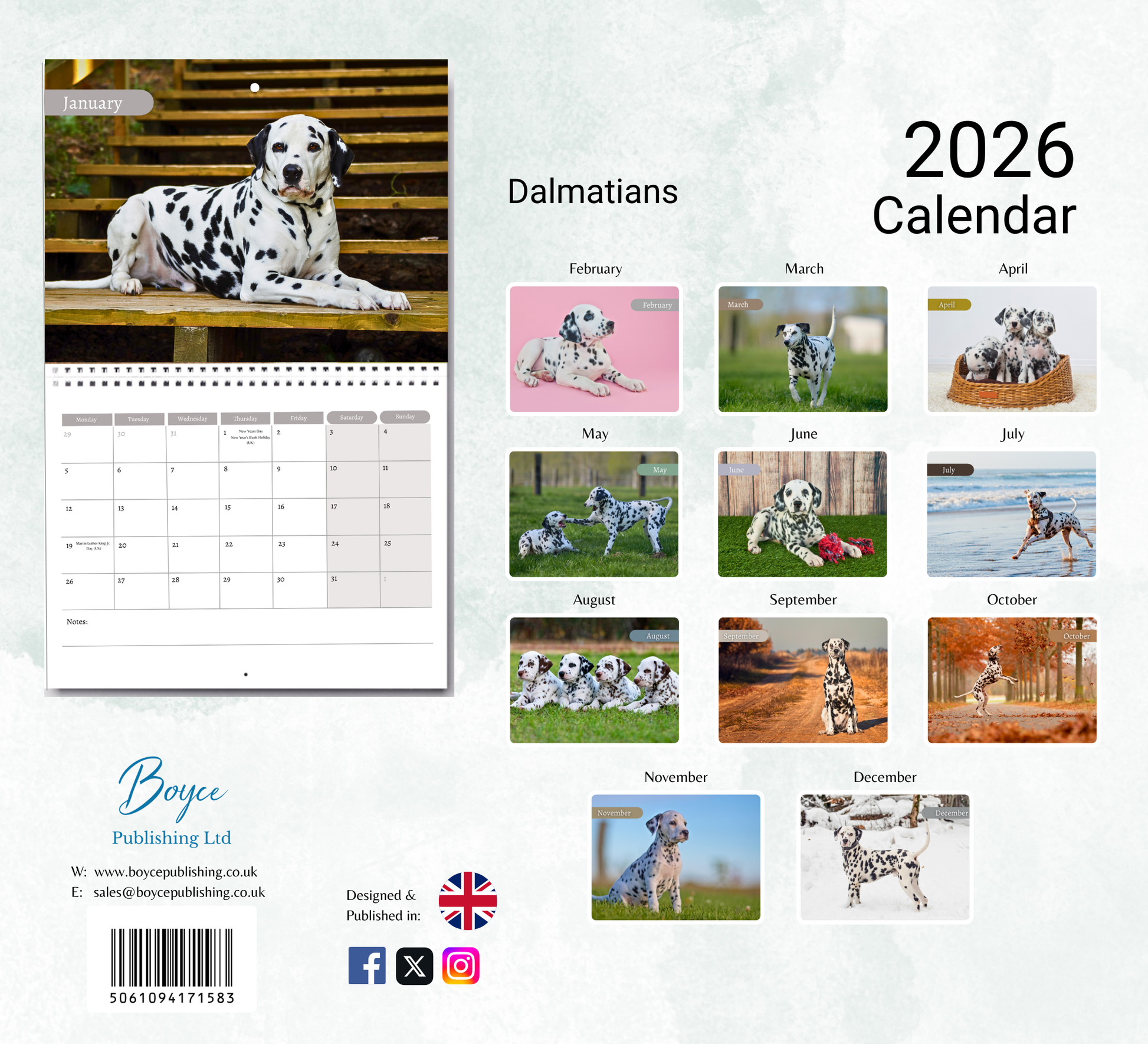 Stay organized with this beautiful 2026 Dalmatian wall calendar. (Jan–Dec 2026).