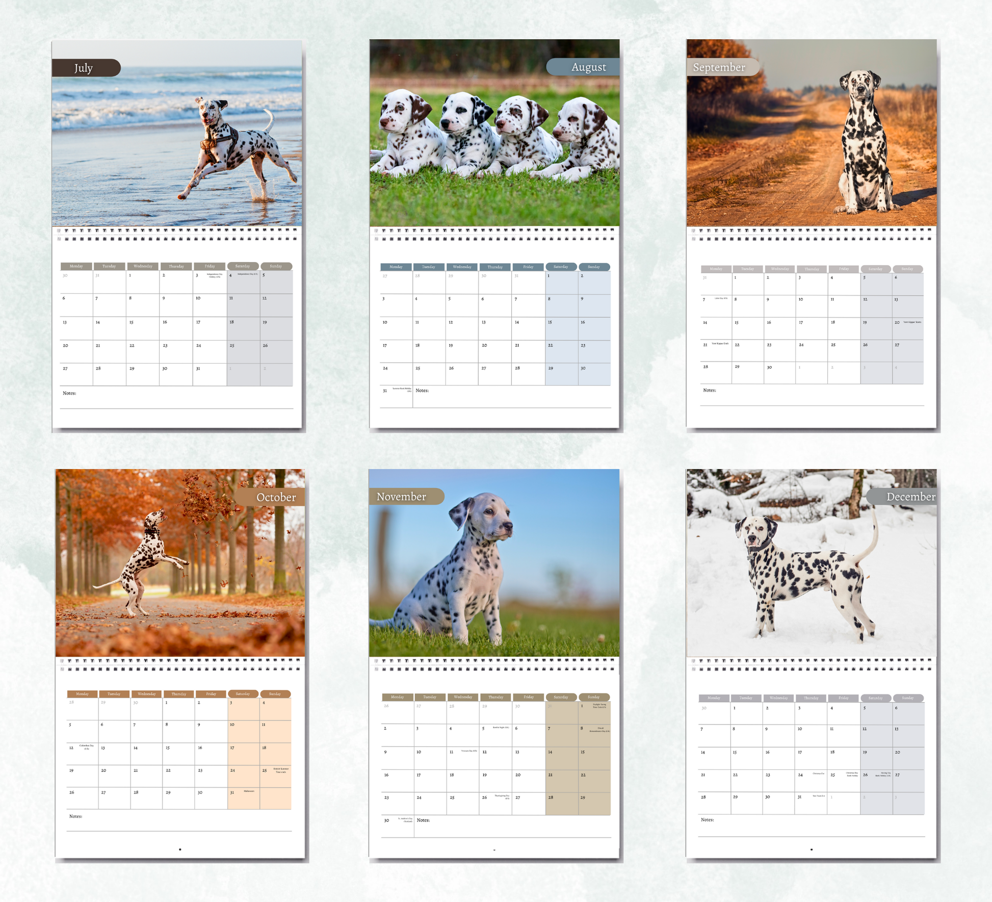 Each page features a vibrant, full-color Dalmatian images paired with a spacious monthly grid for notes and appointments. Brightens your kitchen, living room, office, or classroom with elegant charm.