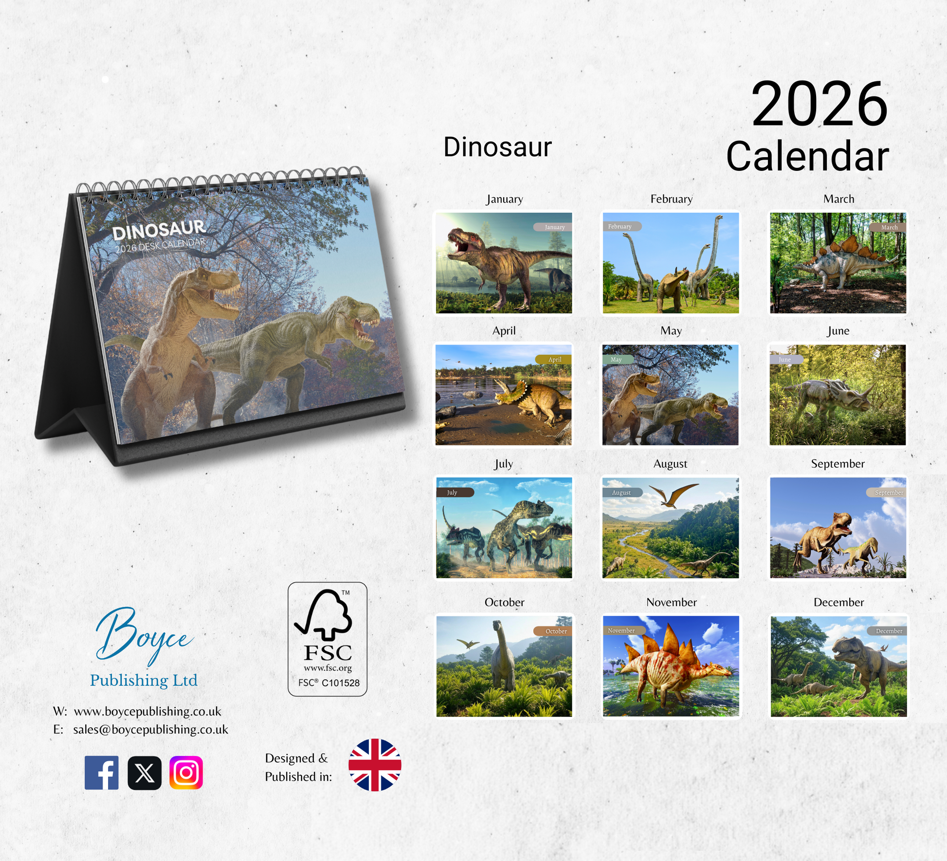 Keep your schedule on track with this beautiful 2026 Dinosaur desk calendar. Featuring ample space for notes, appointments, and reminders, each month is thoughtfully designed to help you stay organized with ease.