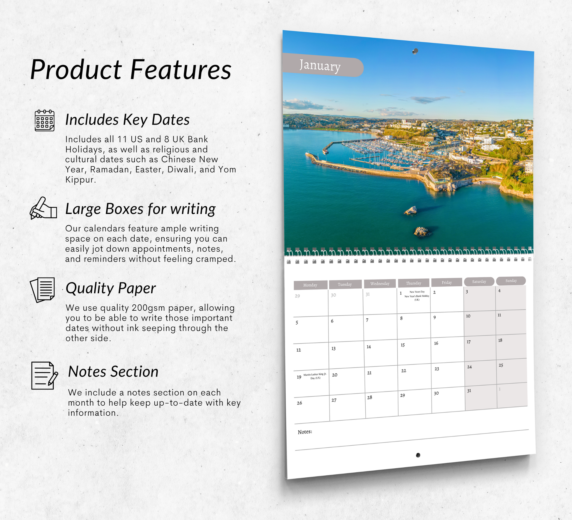 Each page features a vibrant, full-color England images paired with a spacious monthly grid for notes and appointments. Brightens your kitchen, living room, office, or classroom with elegant charm.