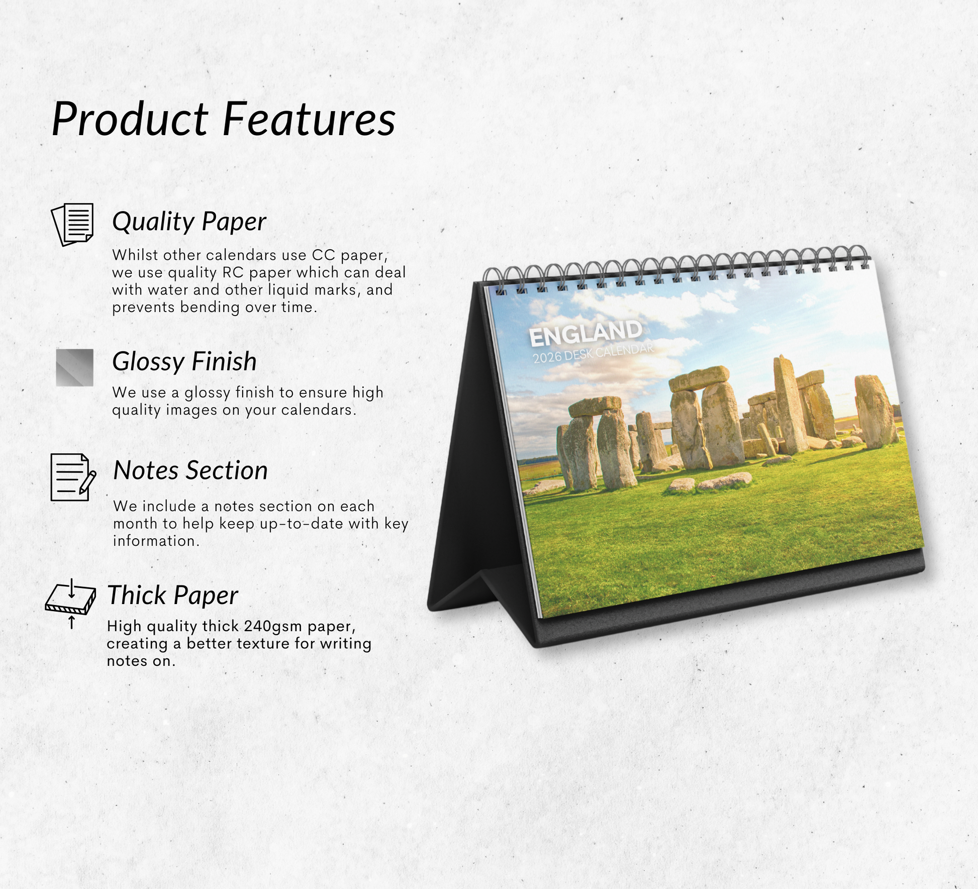 Keep your schedule on track with this beautiful 2026 England desk calendar. Featuring ample space for notes, appointments, and reminders, each month is thoughtfully designed to help you stay organized with ease.