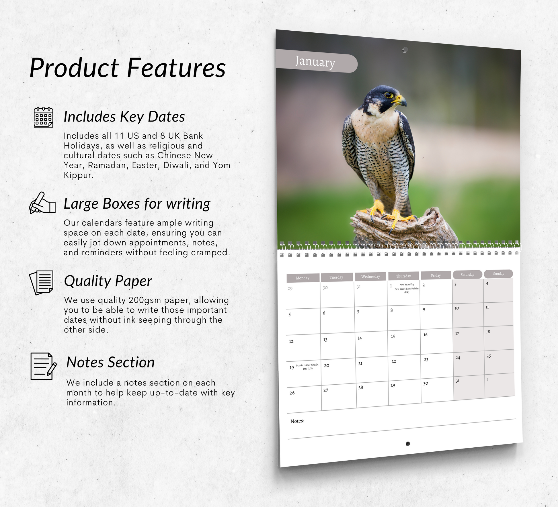 Stay organized with this beautiful 2026 Falcon wall calendar. (Jan–Dec 2026).