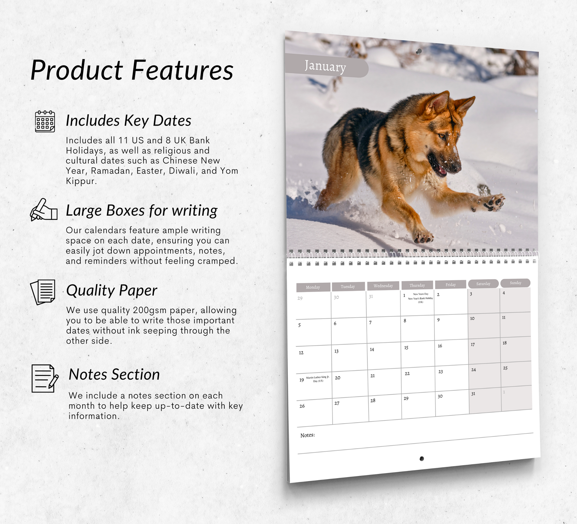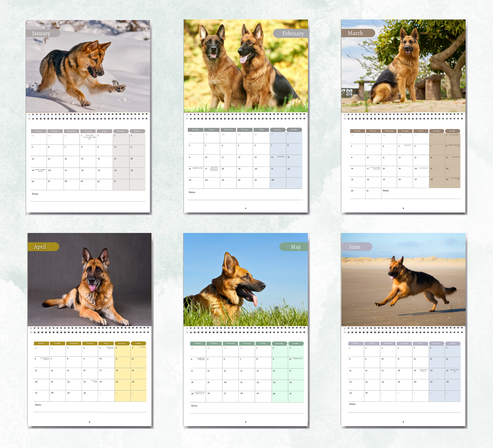 Each page features a vibrant, full-color German Shepherd images paired with a spacious monthly grid for notes and appointments. Brightens your kitchen, living room, office, or classroom with elegant charm.