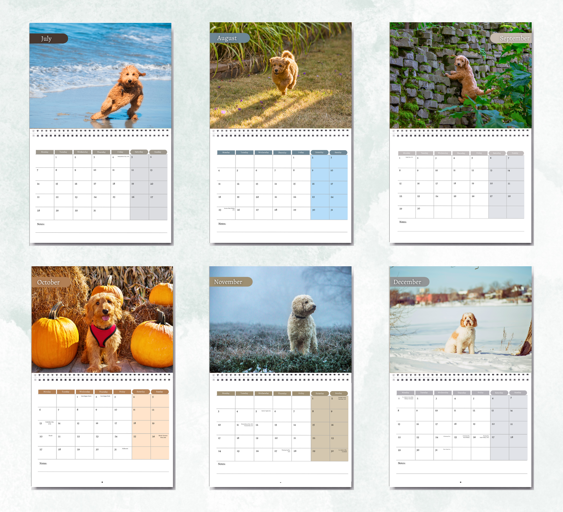 Each page features a vibrant, full-color Goldendoodle images paired with a spacious monthly grid for notes and appointments. Brightens your kitchen, living room, office, or classroom with elegant charm.