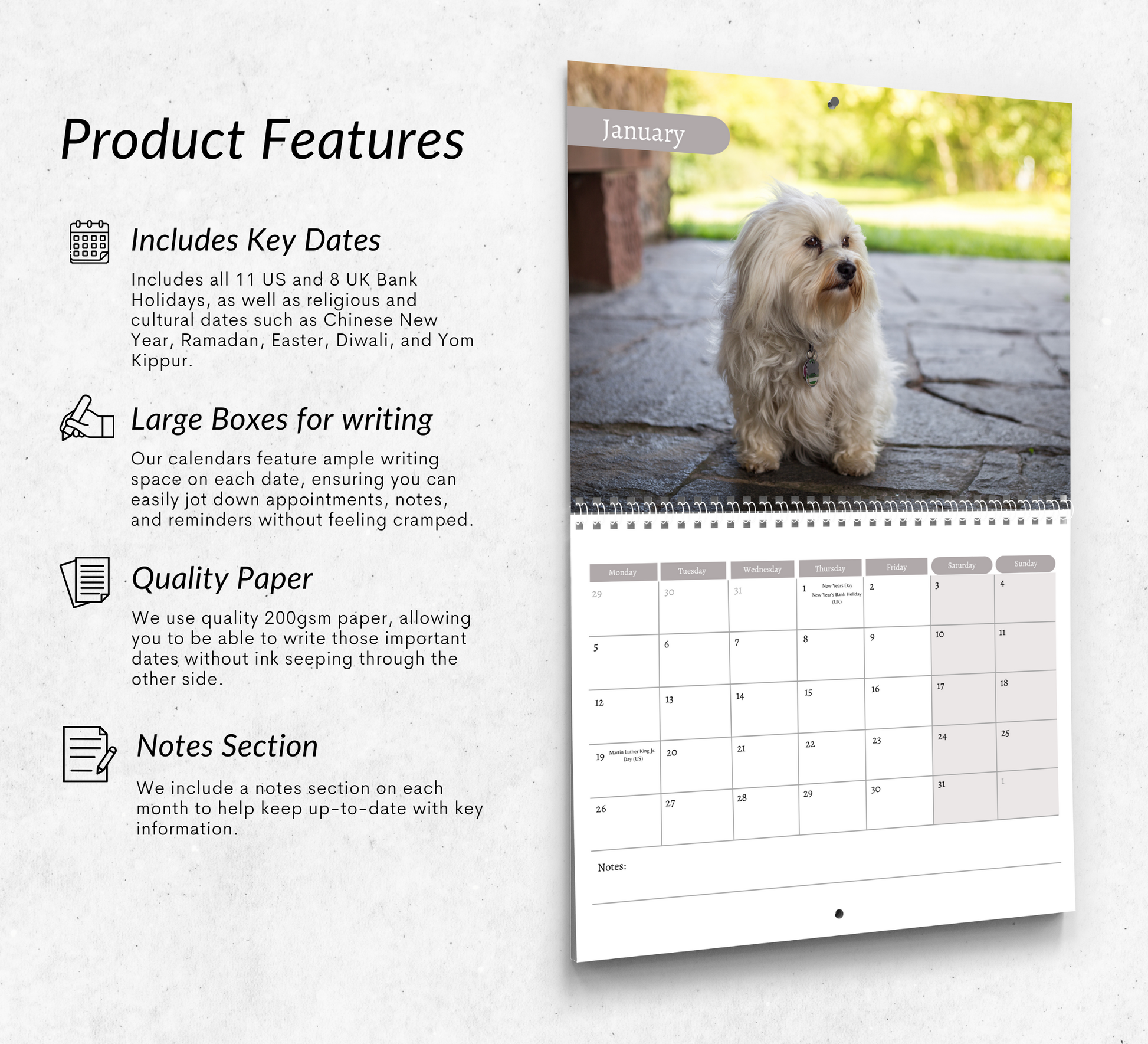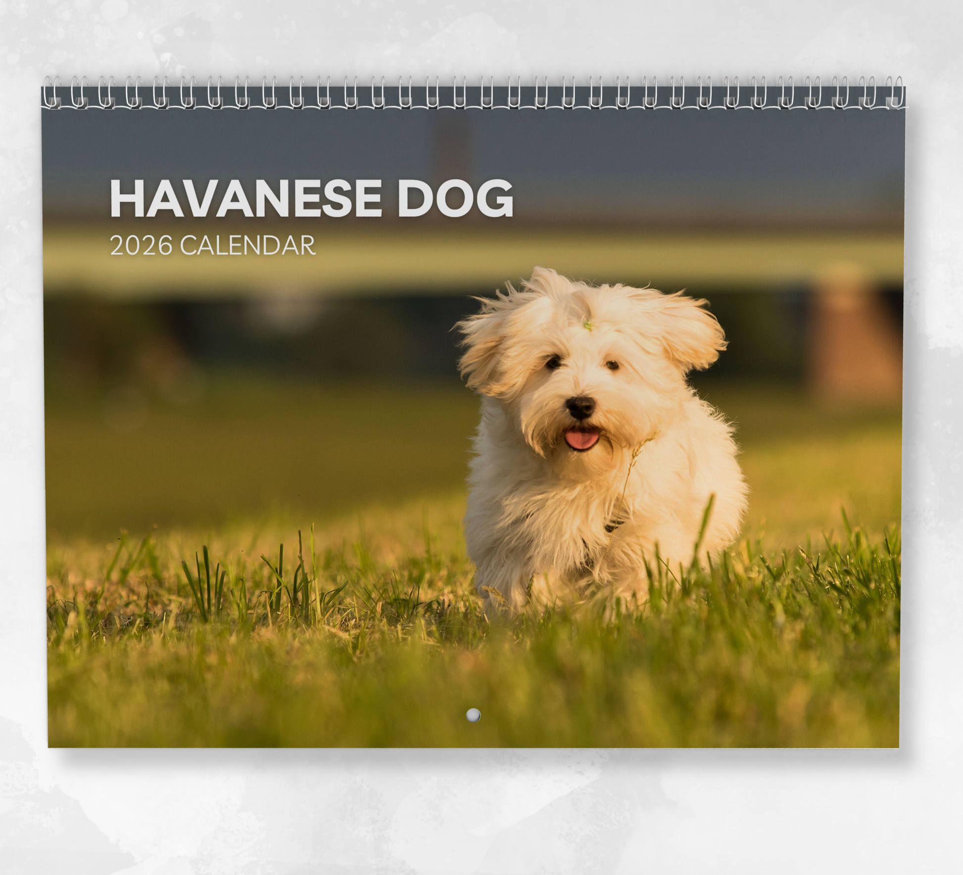 Each page features a vibrant, full-color Havanese Dog images paired with a spacious monthly grid for notes and appointments. Brightens your kitchen, living room, office, or classroom with elegant charm.
