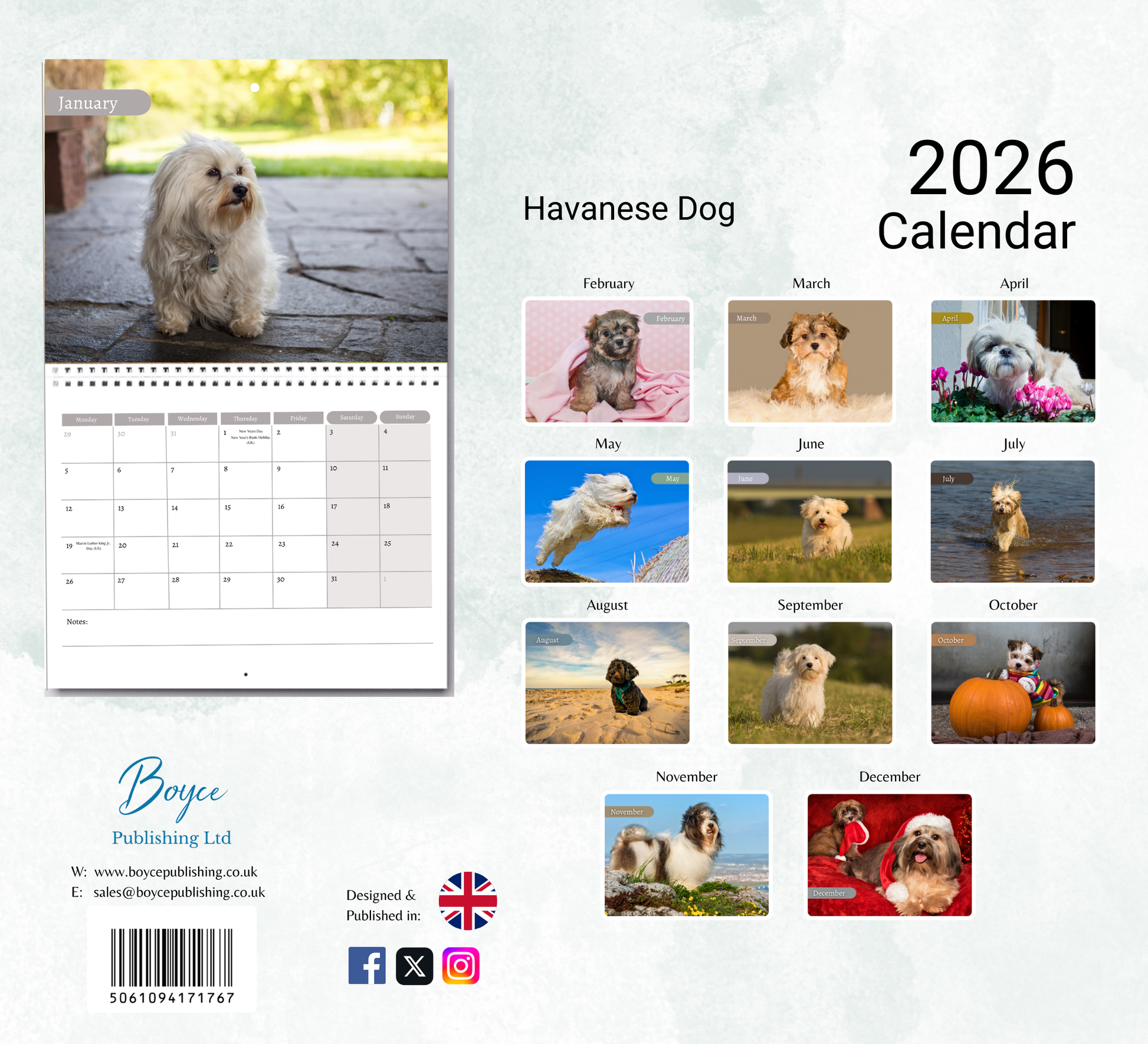 Stay organized with this beautiful 2026 Havanese Dog wall calendar. (Jan–Dec 2026).