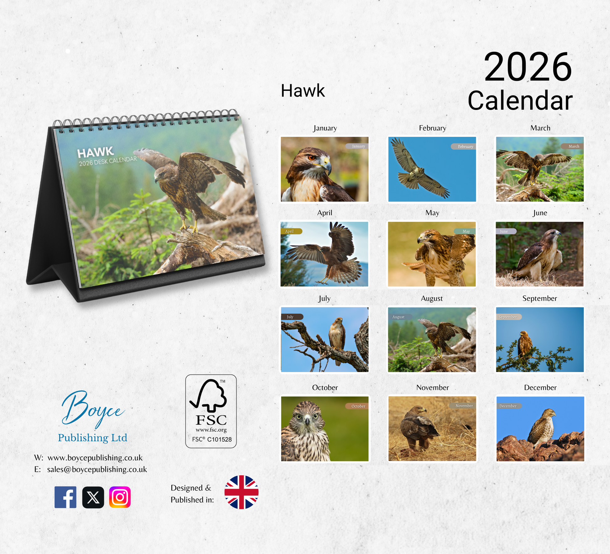 Keep your schedule on track with this beautiful 2026 Hawk desk calendar. Featuring ample space for notes, appointments, and reminders, each month is thoughtfully designed to help you stay organized with ease.