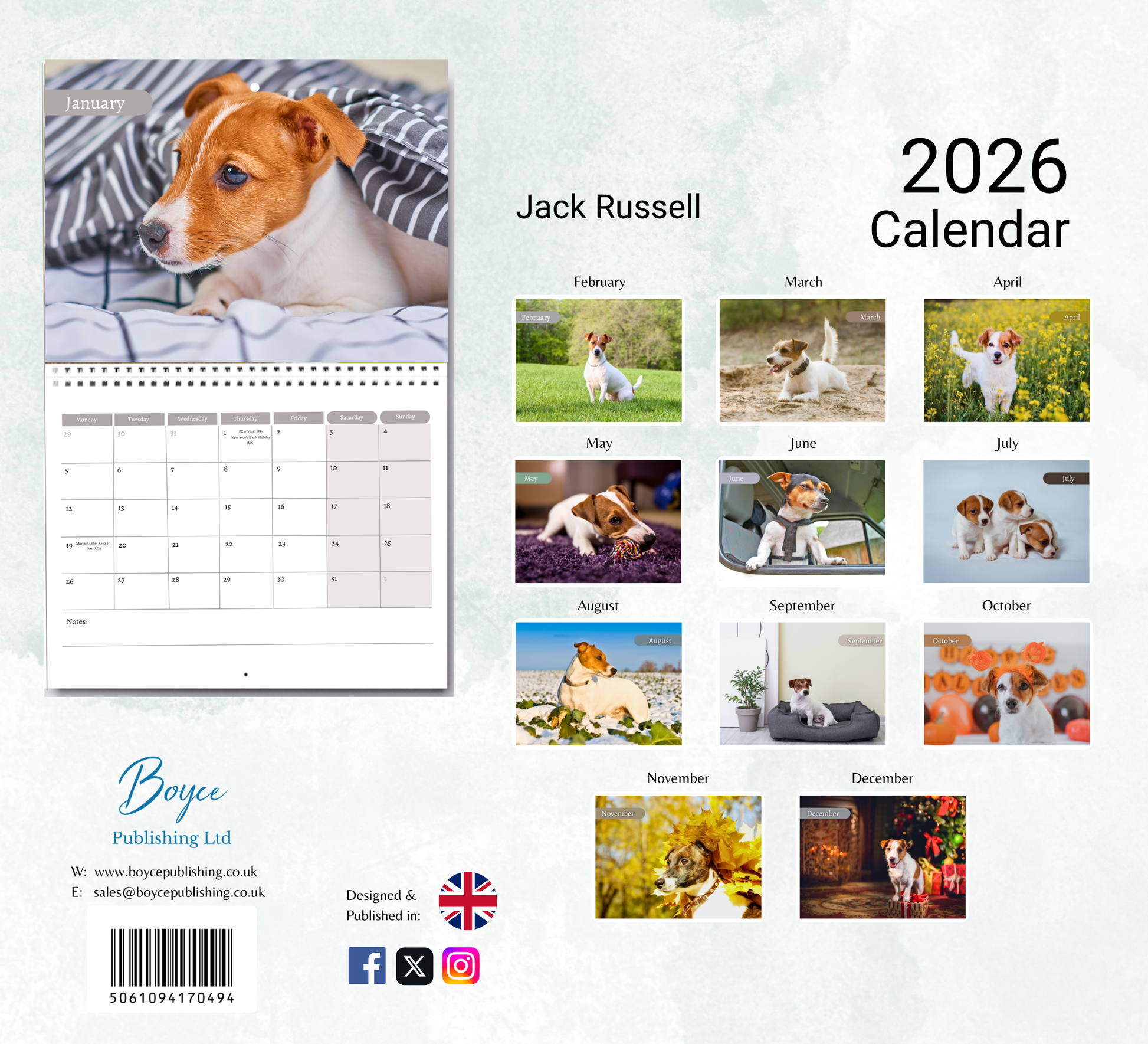 Stay organized with this beautiful 2026 Jack Russell wall calendar. (Jan–Dec 2026).