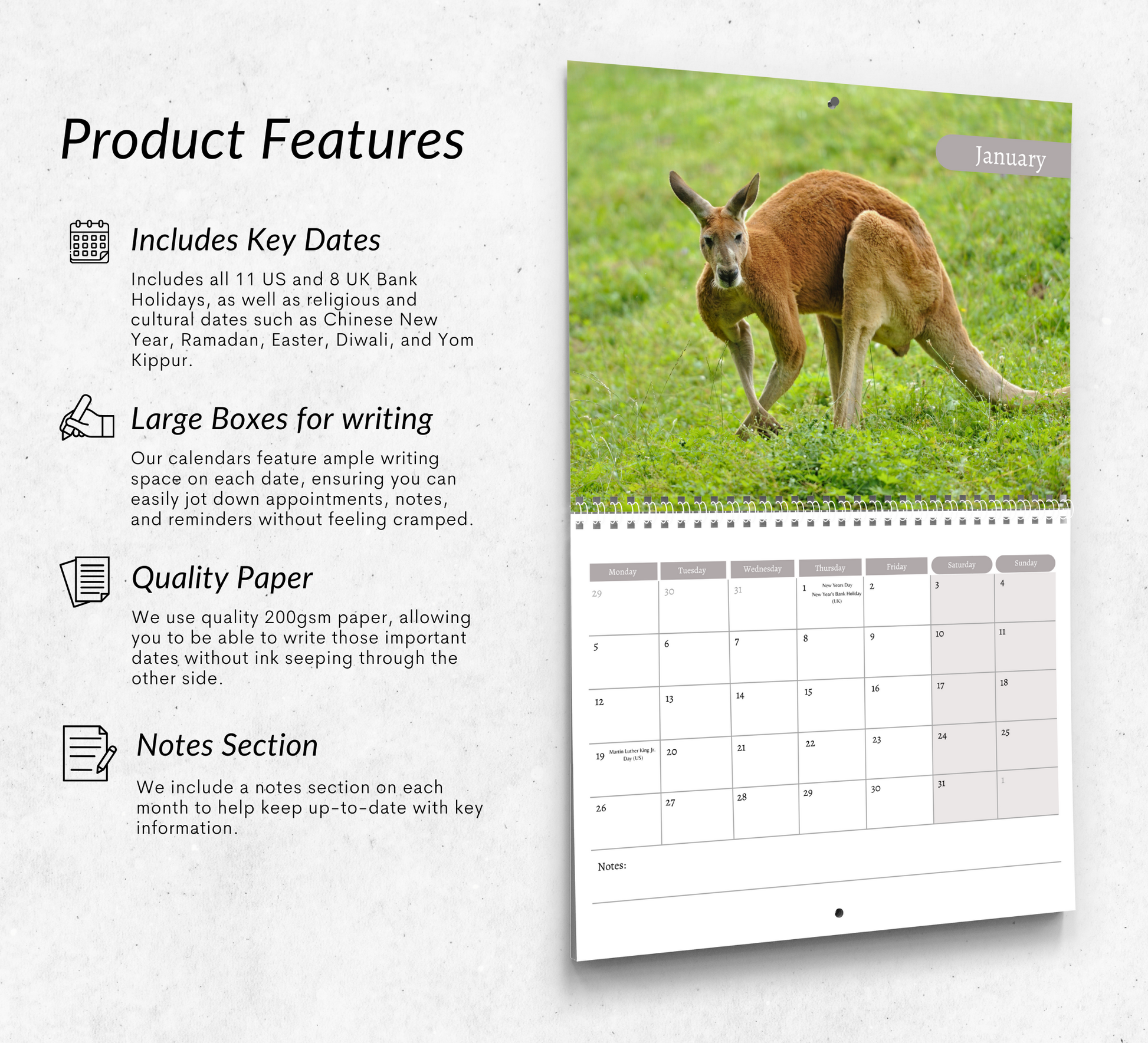 Each page features a vibrant, full-color Kangaroo images paired with a spacious monthly grid for notes and appointments. Brightens your kitchen, living room, office, or classroom with elegant charm.
