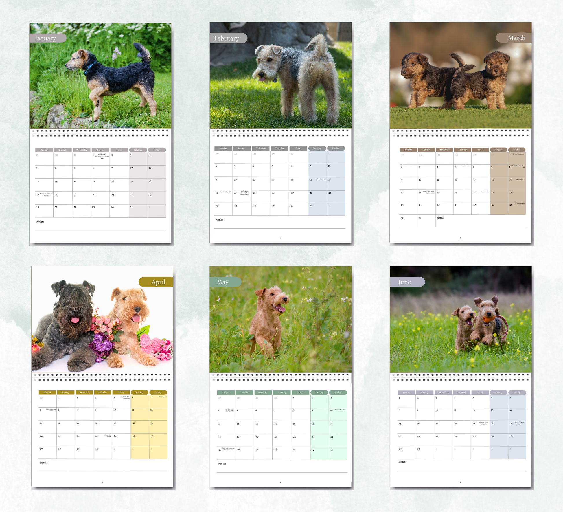Each page features a vibrant, full-color Lakeland Terrier images paired with a spacious monthly grid for notes and appointments. Brightens your kitchen, living room, office, or classroom with elegant charm.