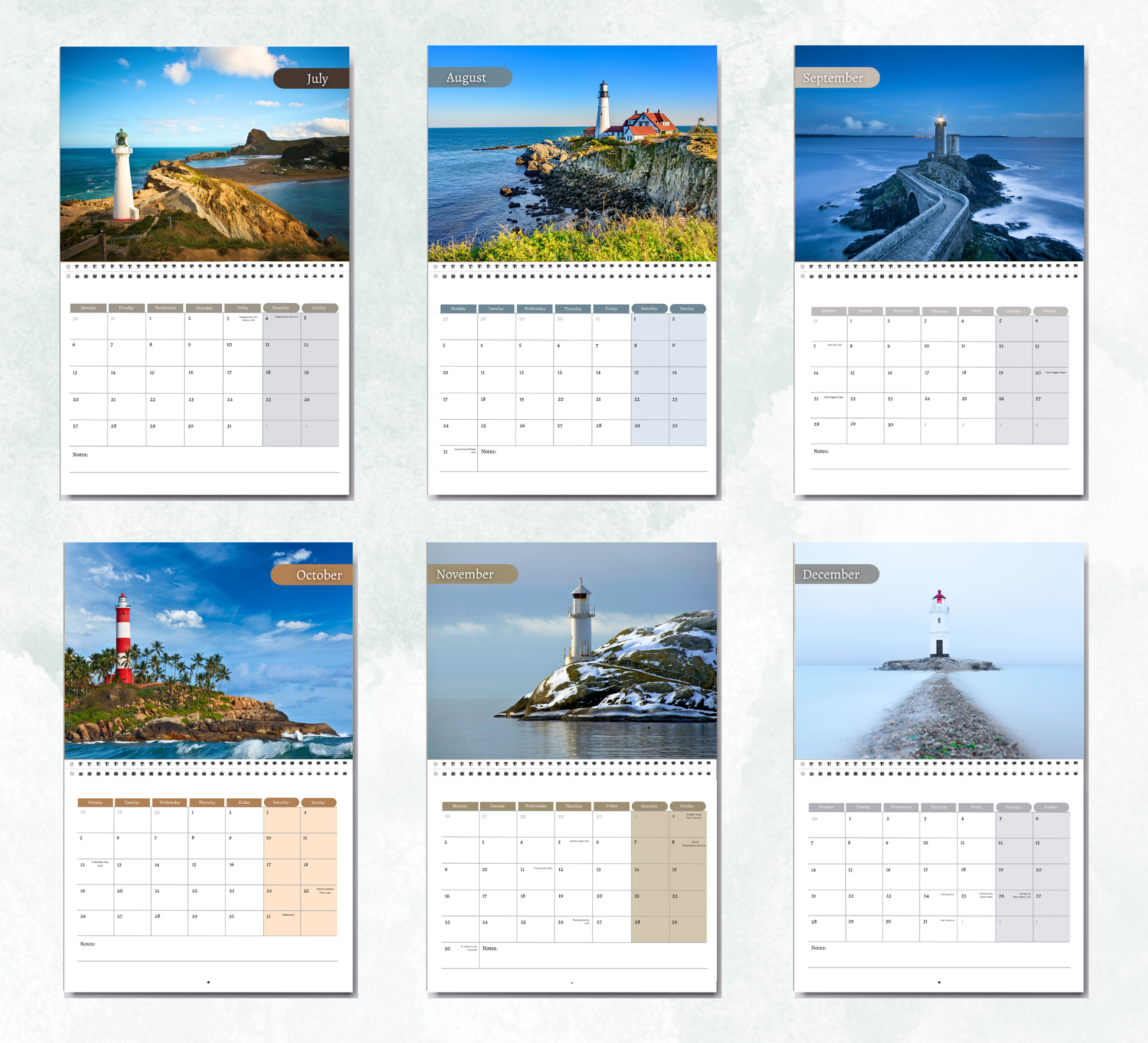 Each page features a vibrant, full-color Lighthouse images paired with a spacious monthly grid for notes and appointments. Brightens your kitchen, living room, office, or classroom with elegant charm.