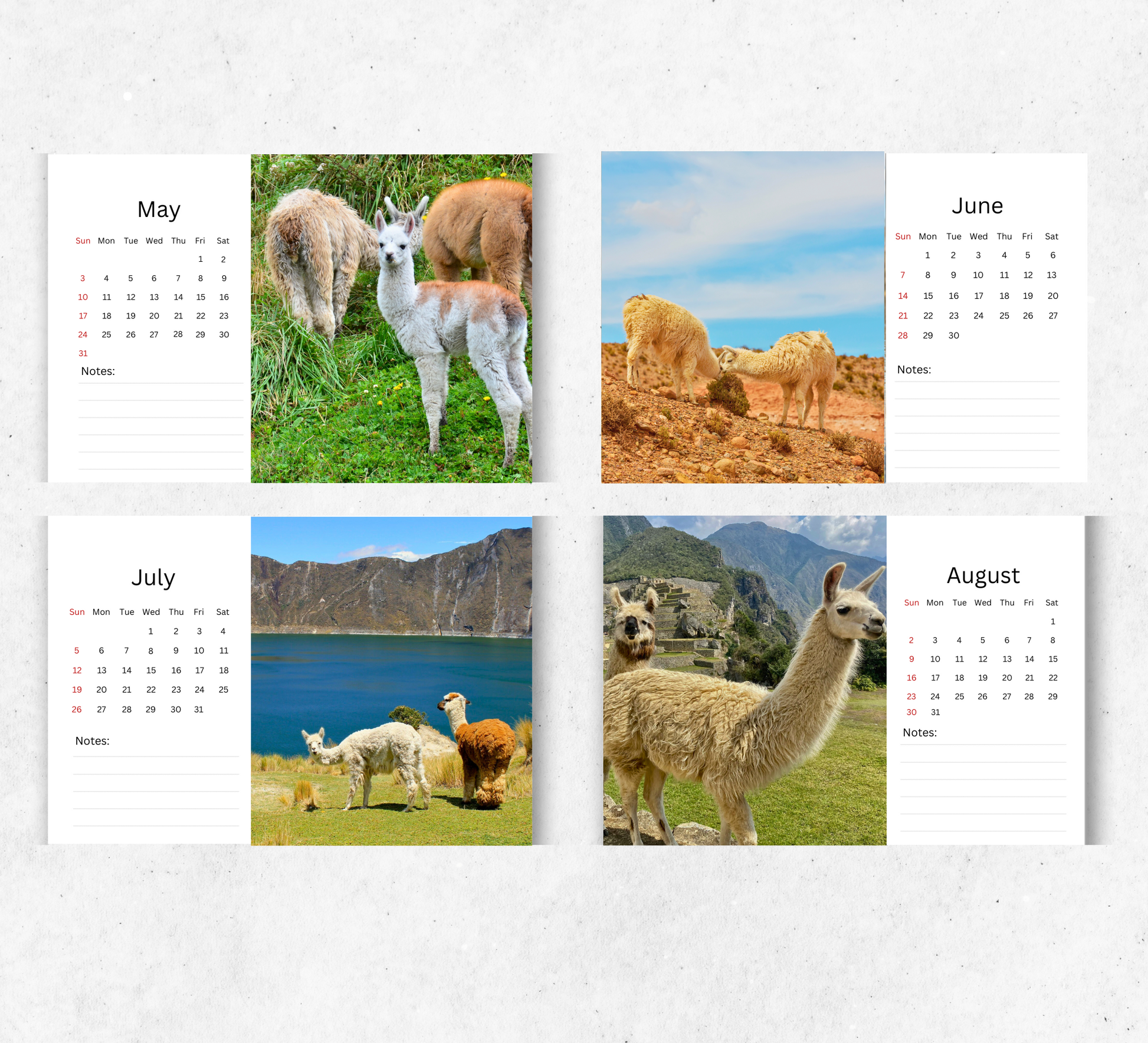 Keep your schedule on track with this beautiful 2026 Llama desk calendar. Featuring ample space for notes, appointments, and reminders, each month is thoughtfully designed to help you stay organized with ease.