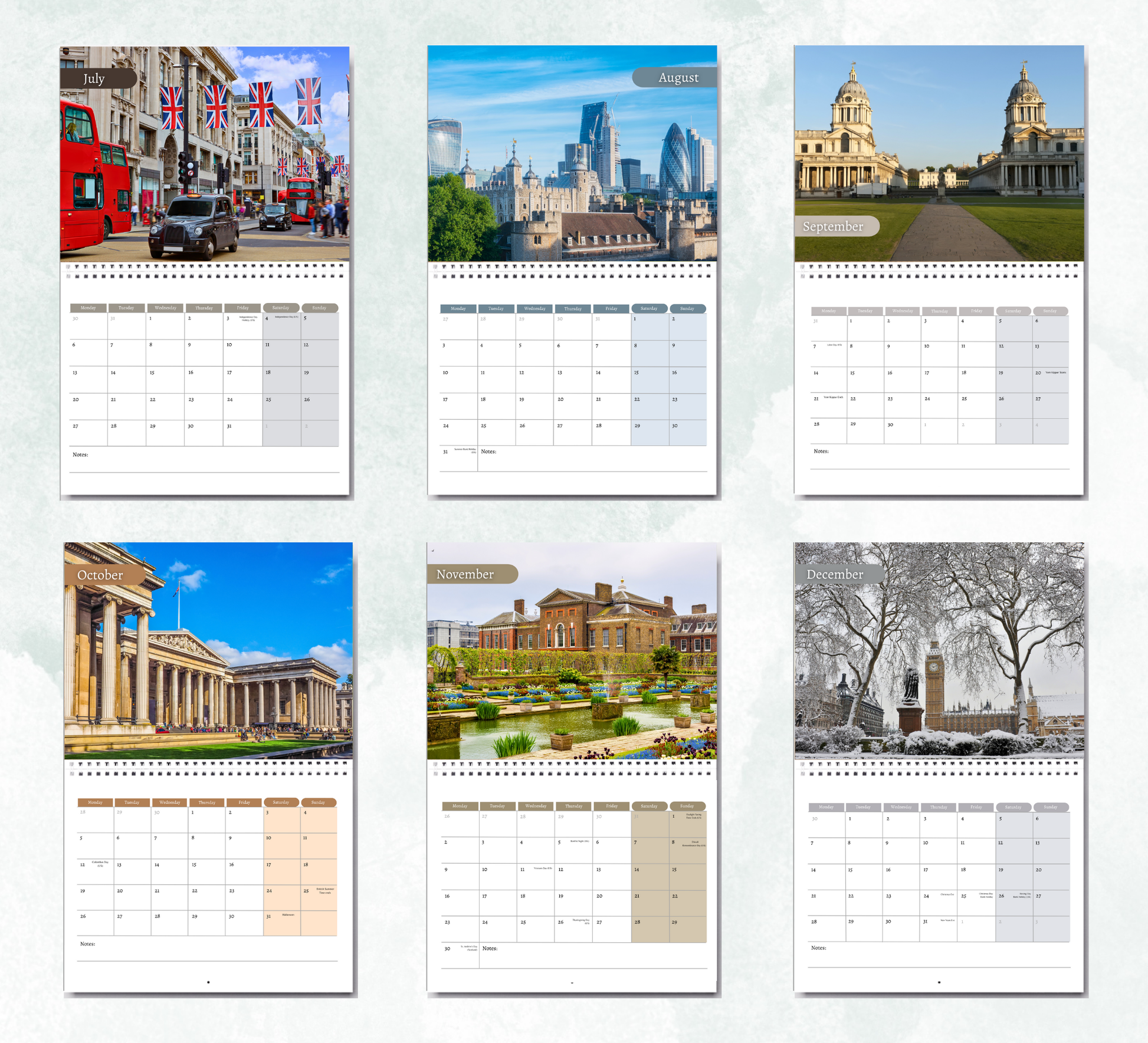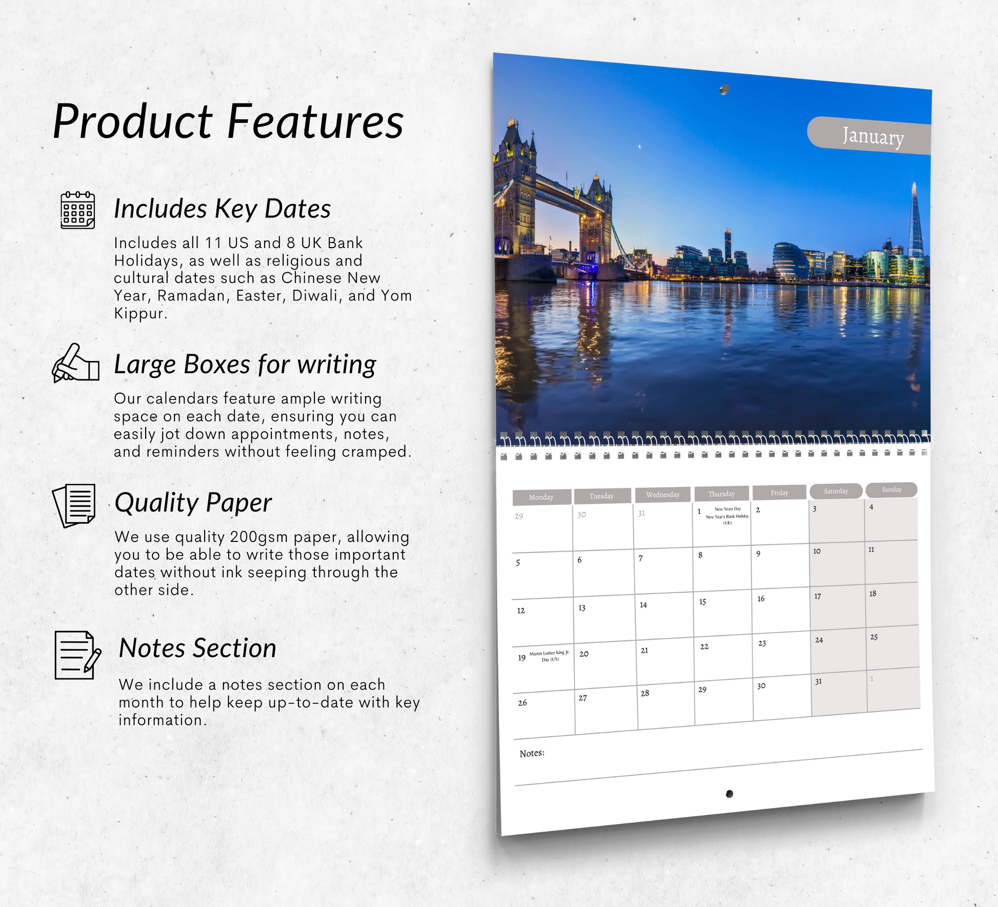 Each page features a vibrant, full-color London images paired with a spacious monthly grid for notes and appointments. Brightens your kitchen, living room, office, or classroom with elegant charm.