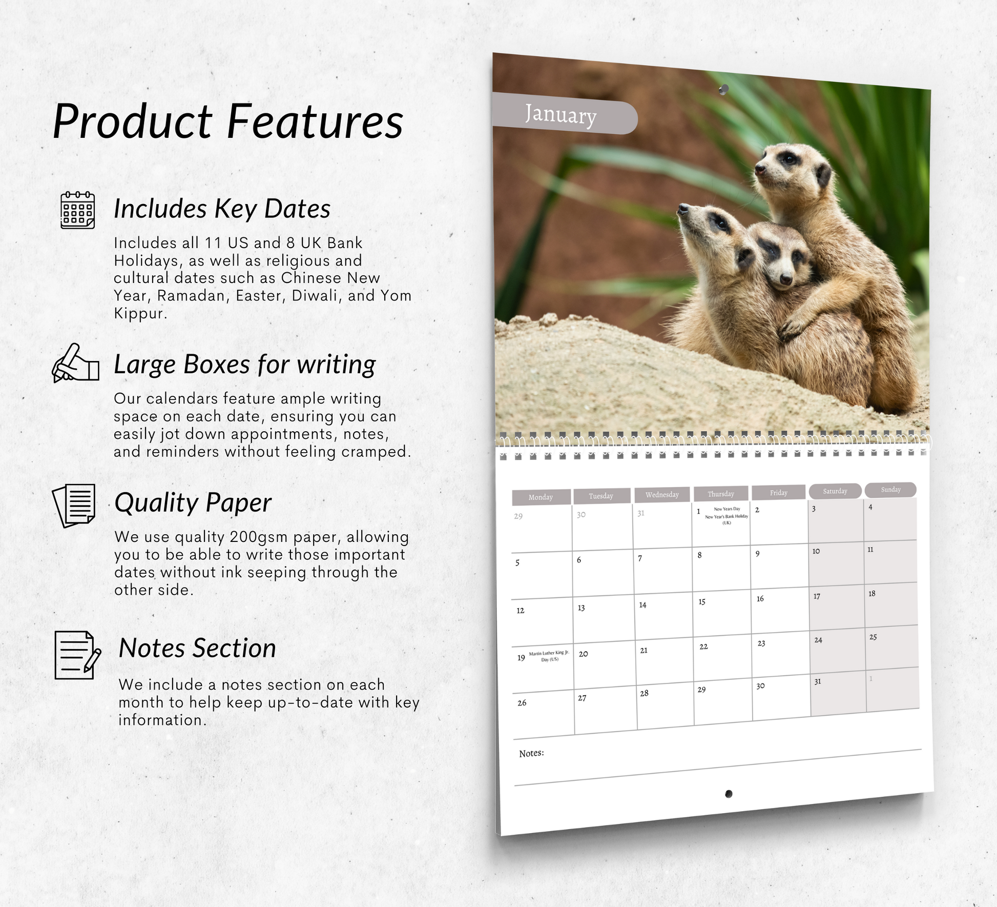 Each page features a vibrant, full-color Meerkat images paired with a spacious monthly grid for notes and appointments. Brightens your kitchen, living room, office, or classroom with elegant charm.