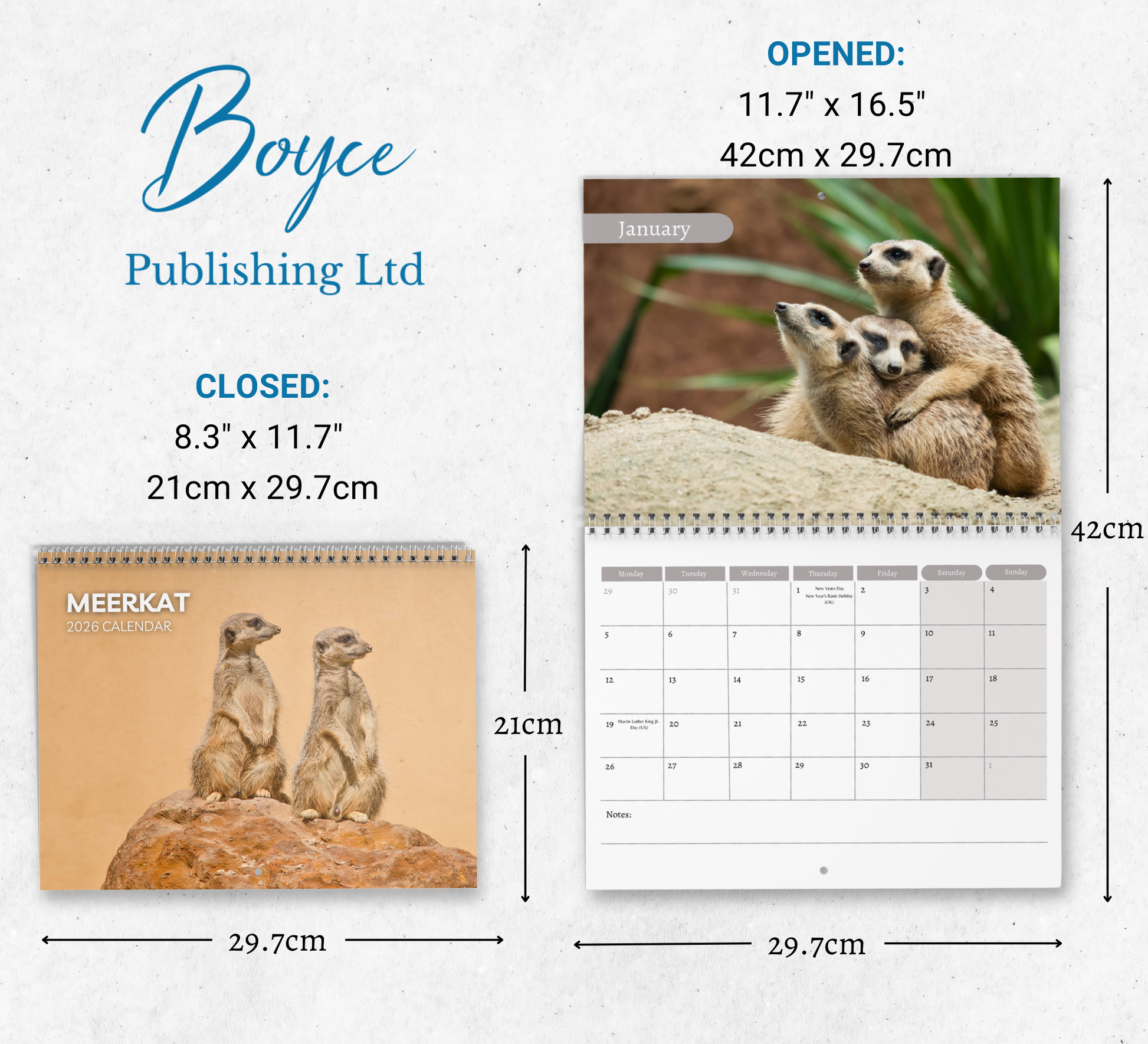 Stay organized with this beautiful 2026 Meerkat wall calendar. (Jan–Dec 2026).