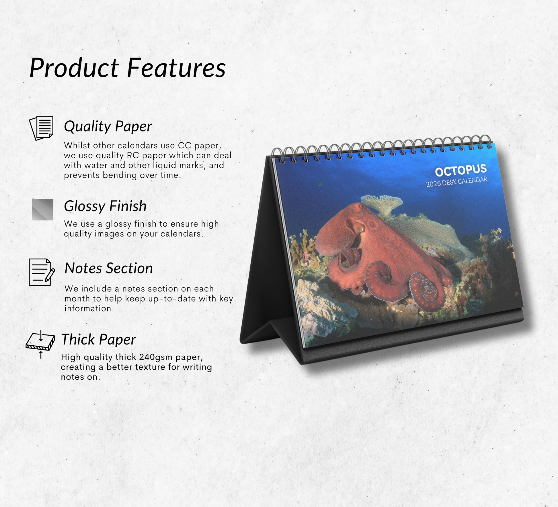 Keep your schedule on track with this beautiful 2026 Octopus desk calendar. Featuring ample space for notes, appointments, and reminders, each month is thoughtfully designed to help you stay organized with ease.