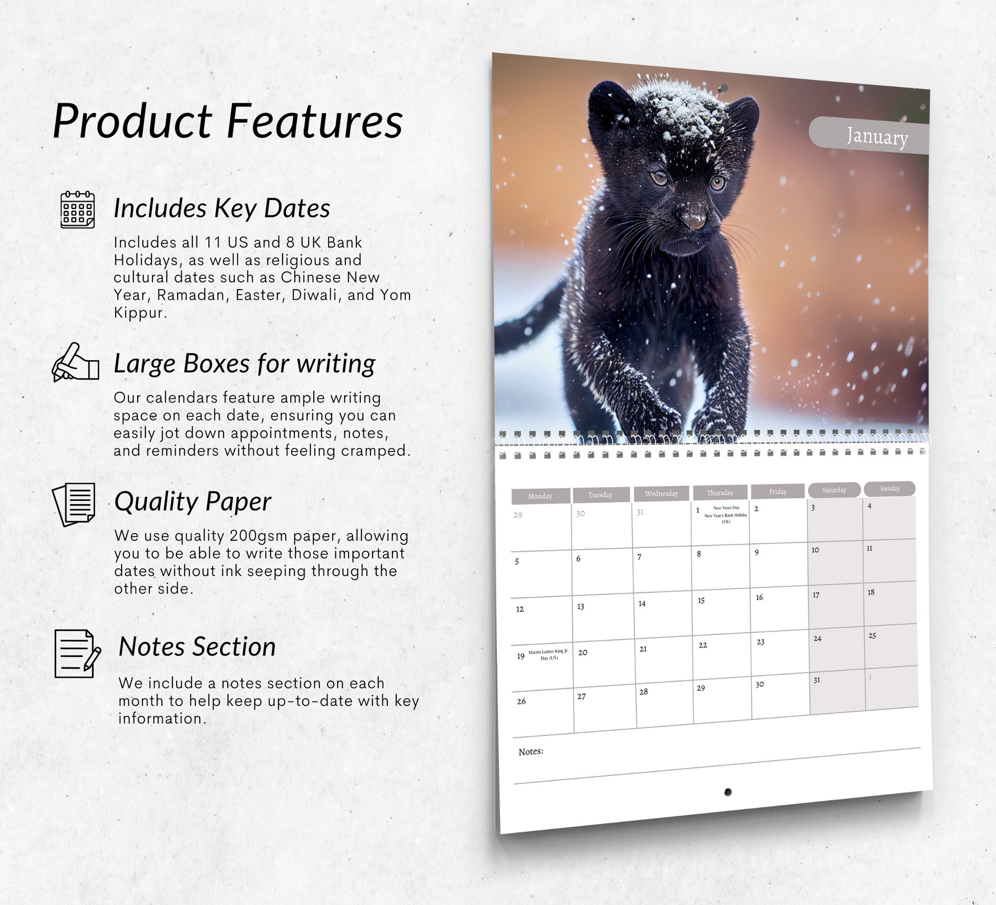 Each page features a vibrant, full-color Panther images paired with a spacious monthly grid for notes and appointments. Brightens your kitchen, living room, office, or classroom with elegant charm.