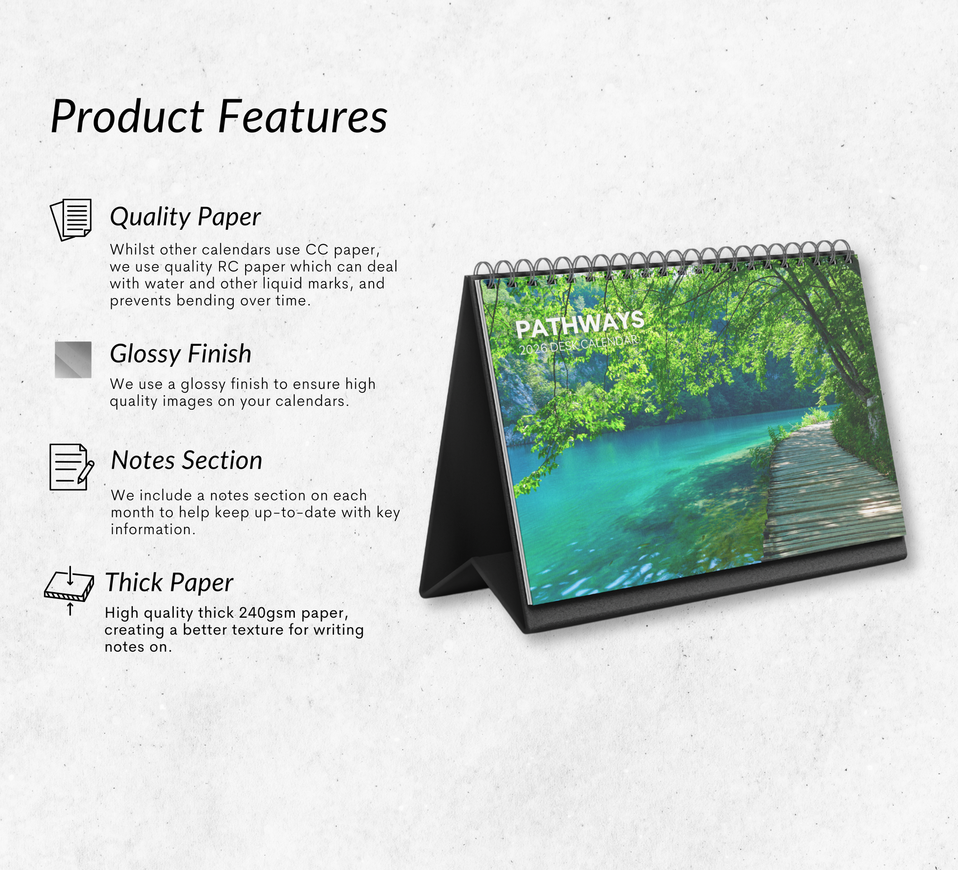 𝖢𝗋𝖺𝖿𝗍𝖾𝖽 𝖿𝗋𝗈𝗆 𝗁𝗂𝗀𝗁-𝗊𝗎𝖺𝗅𝗂𝗍𝗒, 240𝗀𝗌𝗆 𝗍𝗁𝗂𝖼𝗄 𝗉𝖺𝗉𝖾𝗋 𝗍𝗈 𝗉𝗋𝖾𝗏𝖾𝗇𝗍 𝗂𝗇𝗄 𝖻𝗅𝖾𝖾𝖽-𝗍𝗁𝗋𝗈𝗎𝗀𝗁. 𝖳𝗁𝗂𝗌 𝖼𝗁𝖺𝗋𝗆𝗂𝗇𝗀 𝖼𝖺𝗅𝖾𝗇𝖽𝖺𝗋 𝗂𝗌 𝗌𝗎𝗉𝗉𝗈𝗋𝗍𝖾𝖽 𝖻𝗒 𝖺 𝗌𝗍𝗎𝗋𝖽𝗒 𝖻𝗅𝖺𝖼𝗄 𝖻𝗈𝖺𝗋𝖽, 𝖺𝗅𝗅𝗈𝗐𝗂𝗇𝗀 𝗂𝗍 𝗍𝗈 𝗌𝗍𝖺𝗇𝖽 𝗎𝗉𝗋𝗂𝗀𝗁𝗍 𝗈𝗇 𝗒𝗈𝗎𝗋 𝖽𝖾𝗌𝗄.