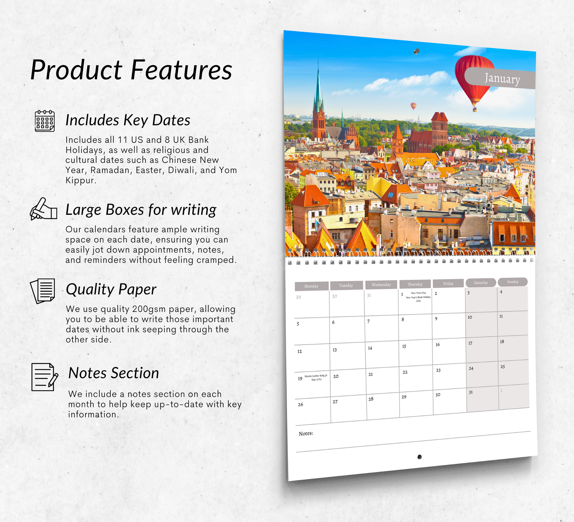 Each page features a vibrant, full-color Poland images paired with a spacious monthly grid for notes and appointments. Brightens your kitchen, living room, office, or classroom with elegant charm.