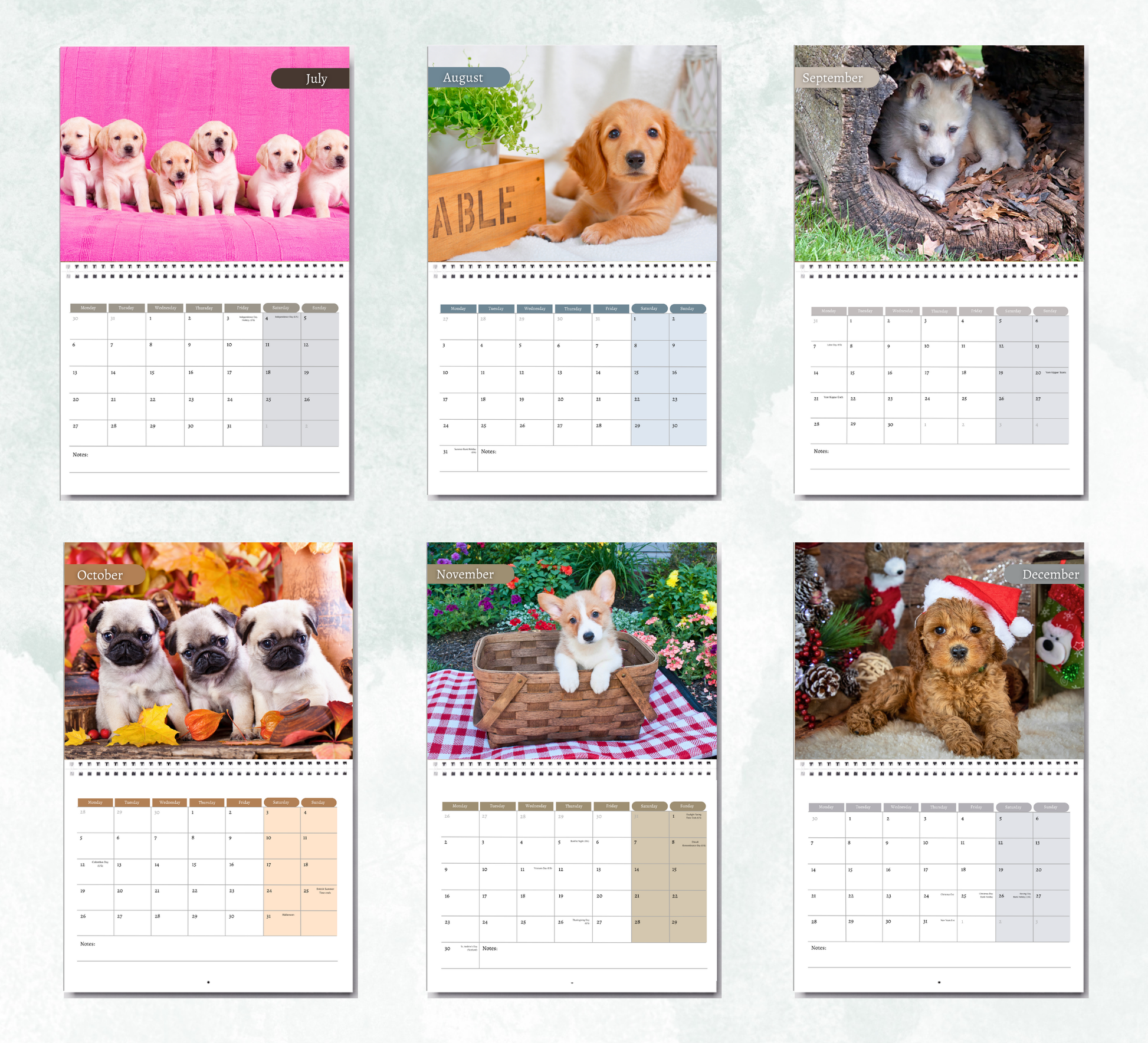 Each page features a vibrant, full-color Puppy images paired with a spacious monthly grid for notes and appointments. Brightens your kitchen, living room, office, or classroom with elegant charm.