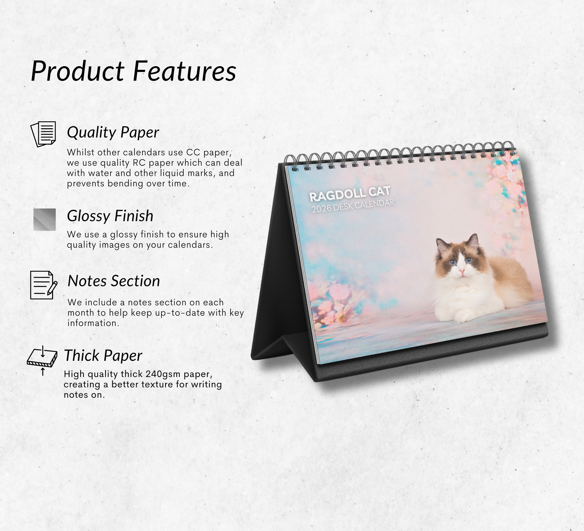 𝖢𝗋𝖺𝖿𝗍𝖾𝖽 𝖿𝗋𝗈𝗆 𝗁𝗂𝗀𝗁-𝗊𝗎𝖺𝗅𝗂𝗍𝗒, 240𝗀𝗌𝗆 𝗍𝗁𝗂𝖼𝗄 𝗉𝖺𝗉𝖾𝗋 𝗍𝗈 𝗉𝗋𝖾𝗏𝖾𝗇𝗍 𝗂𝗇𝗄 𝖻𝗅𝖾𝖾𝖽-𝗍𝗁𝗋𝗈𝗎𝗀𝗁. 𝖳𝗁𝗂𝗌 𝖼𝗁𝖺𝗋𝗆𝗂𝗇𝗀 𝖼𝖺𝗅𝖾𝗇𝖽𝖺𝗋 𝗂𝗌 𝗌𝗎𝗉𝗉𝗈𝗋𝗍𝖾𝖽 𝖻𝗒 𝖺 𝗌𝗍𝗎𝗋𝖽𝗒 𝖻𝗅𝖺𝖼𝗄 𝖻𝗈𝖺𝗋𝖽, 𝖺𝗅𝗅𝗈𝗐𝗂𝗇𝗀 𝗂𝗍 𝗍𝗈 𝗌𝗍𝖺𝗇𝖽 𝗎𝗉𝗋𝗂𝗀𝗁𝗍 𝗈𝗇 𝗒𝗈𝗎𝗋 𝖽𝖾𝗌𝗄.