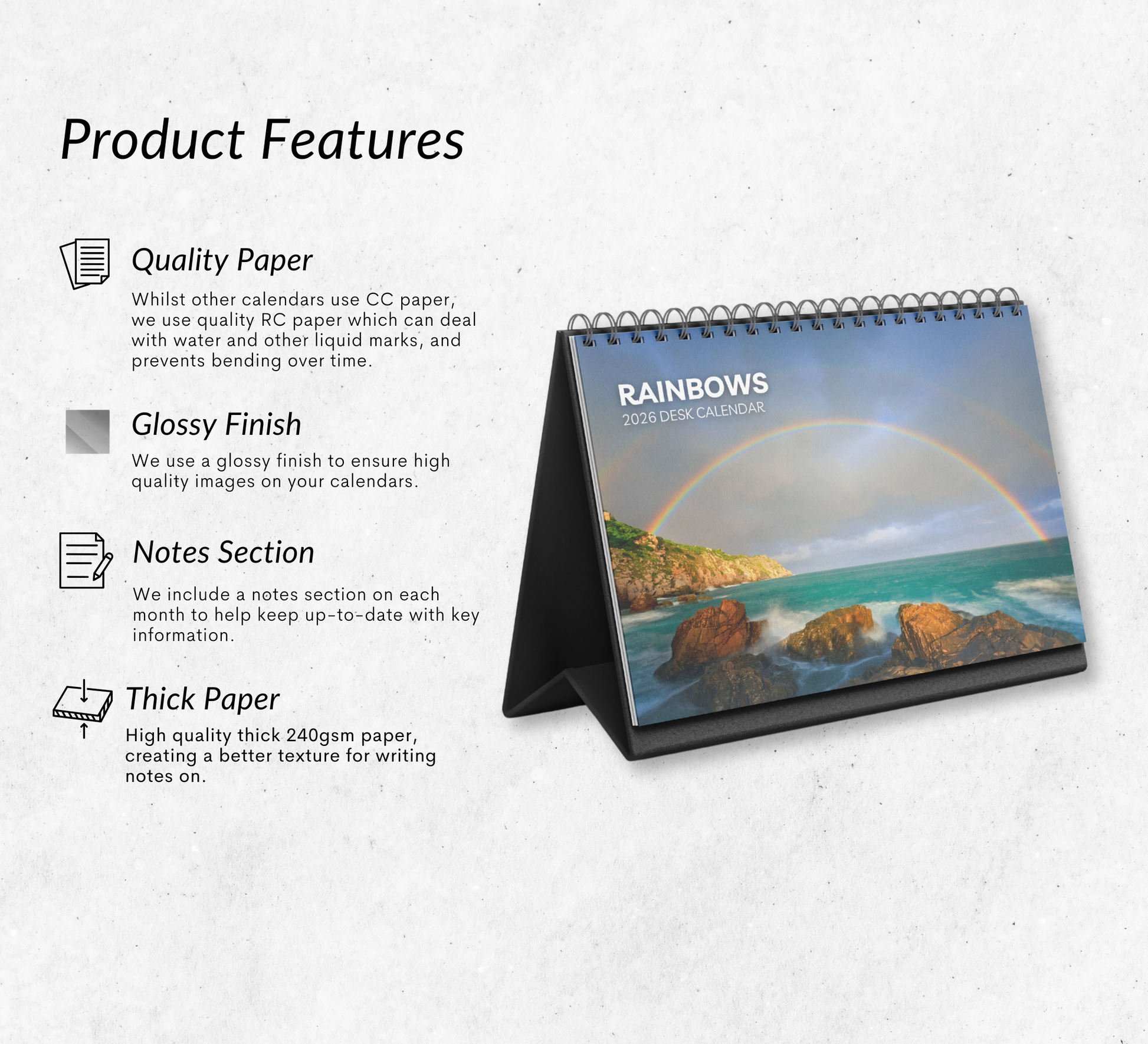 Keep your schedule on track with this beautiful 2026 Rainbows desk calendar. Featuring ample space for notes, appointments, and reminders, each month is thoughtfully designed to help you stay organized with ease.