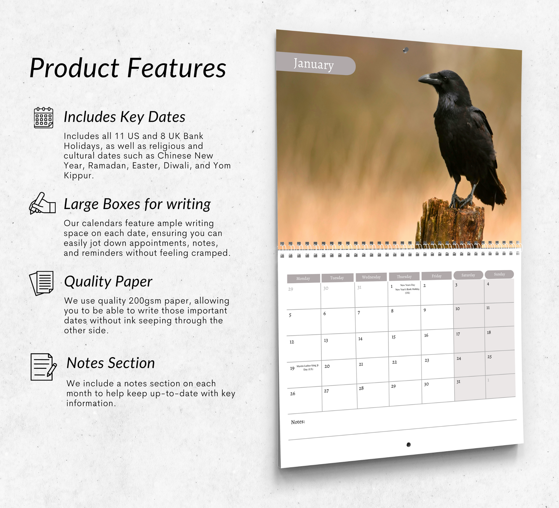 Each page features a vibrant, full-color Raven images paired with a spacious monthly grid for notes and appointments. Brightens your kitchen, living room, office, or classroom with elegant charm.