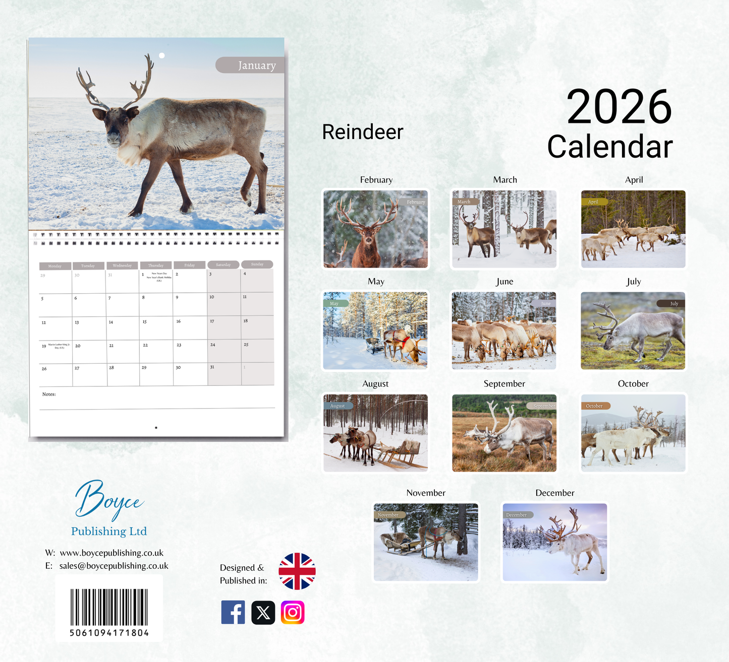 Stay organized with this beautiful 2026 Reindeer wall calendar. (Jan–Dec 2026).