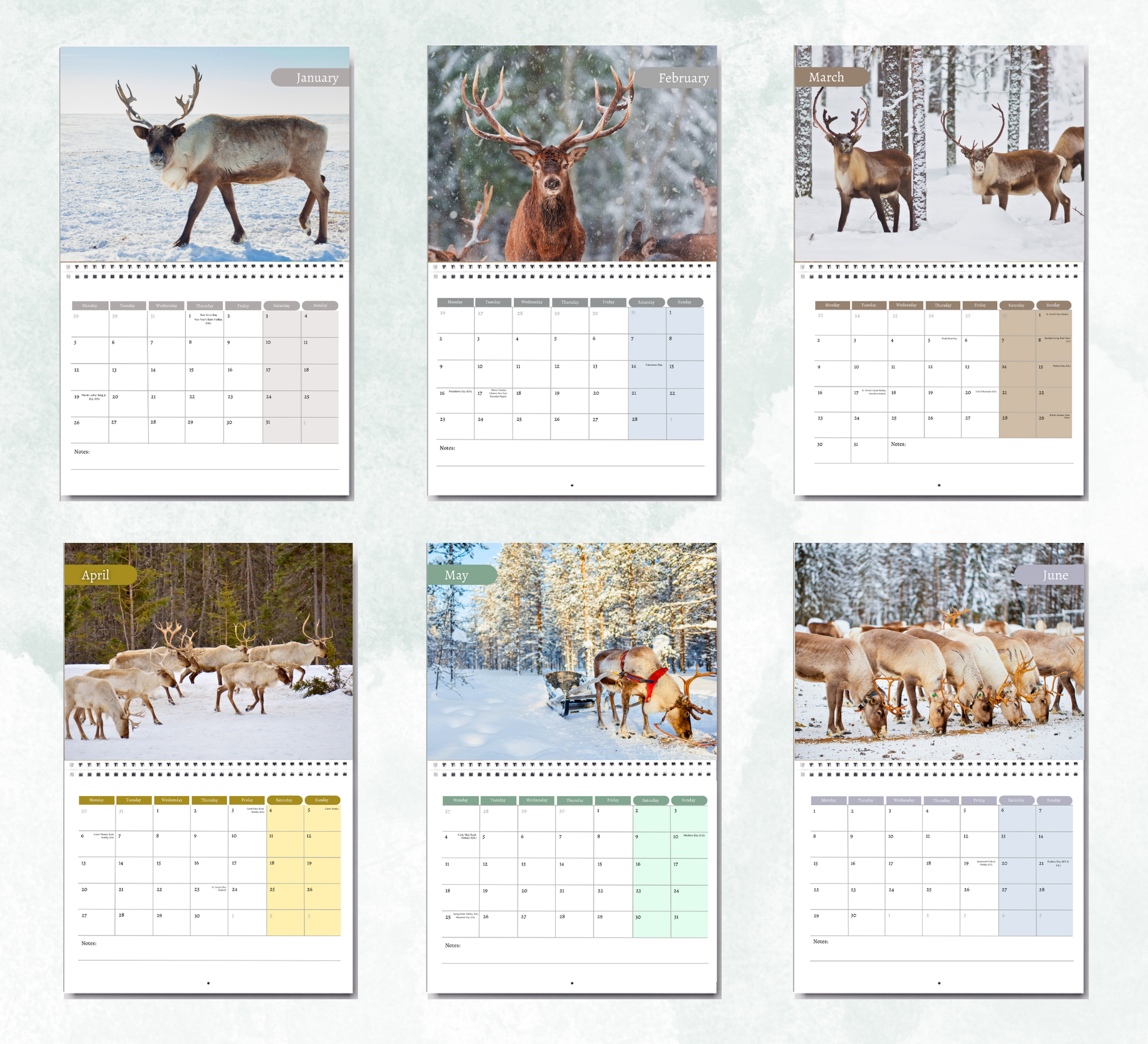 Each page features a vibrant, full-color Reindeer images paired with a spacious monthly grid for notes and appointments. Brightens your kitchen, living room, office, or classroom with elegant charm.