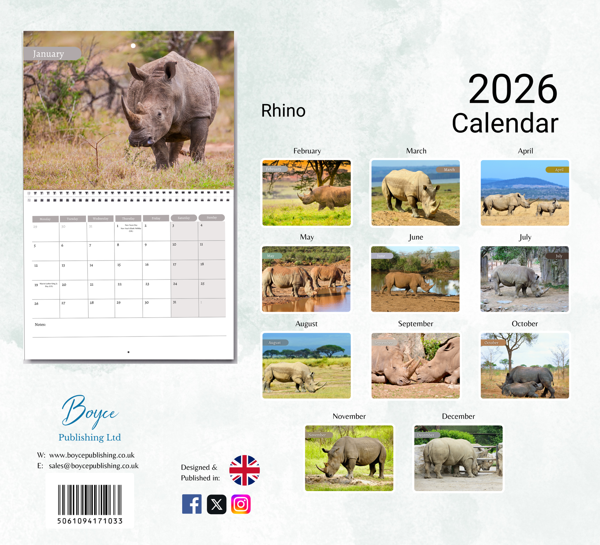 Stay organized with this beautiful 2026 Rhino wall calendar. (Jan–Dec 2026).