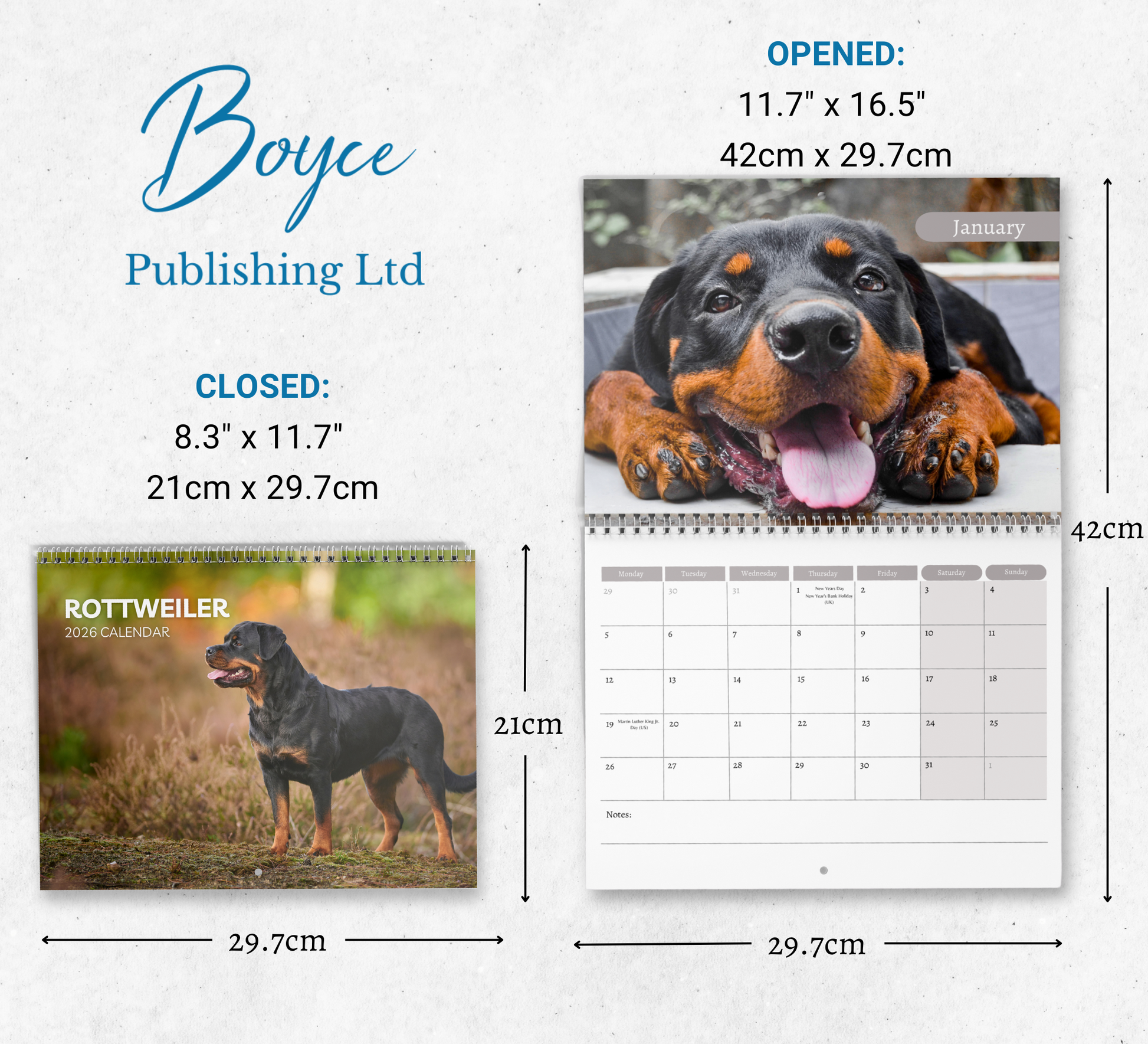 Stay organized with this beautiful 2026 Rottweiler wall calendar. (Jan–Dec 2026).