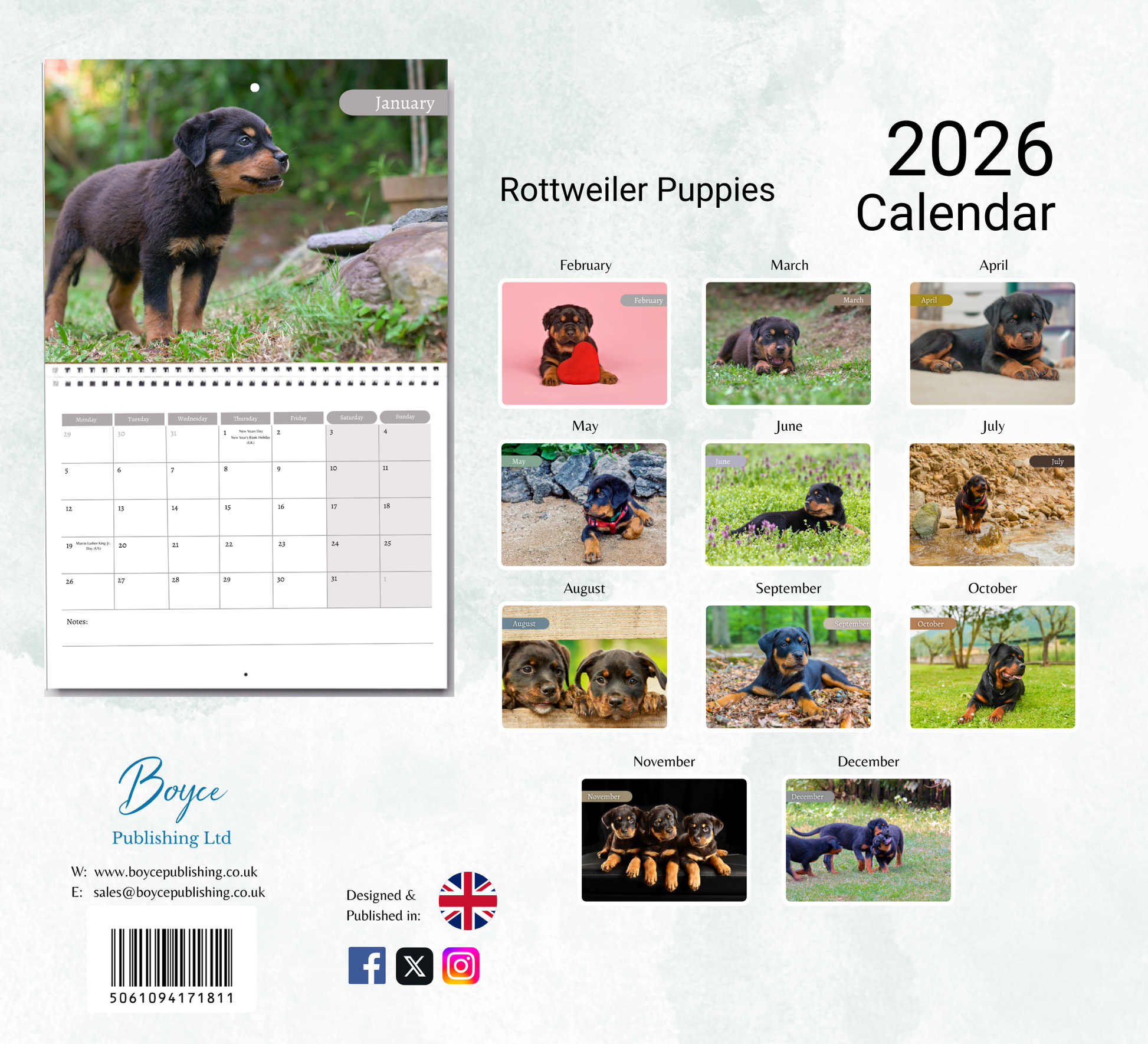 Stay organized with this beautiful 2026 Rottweiler Puppies wall calendar. (Jan–Dec 2026).