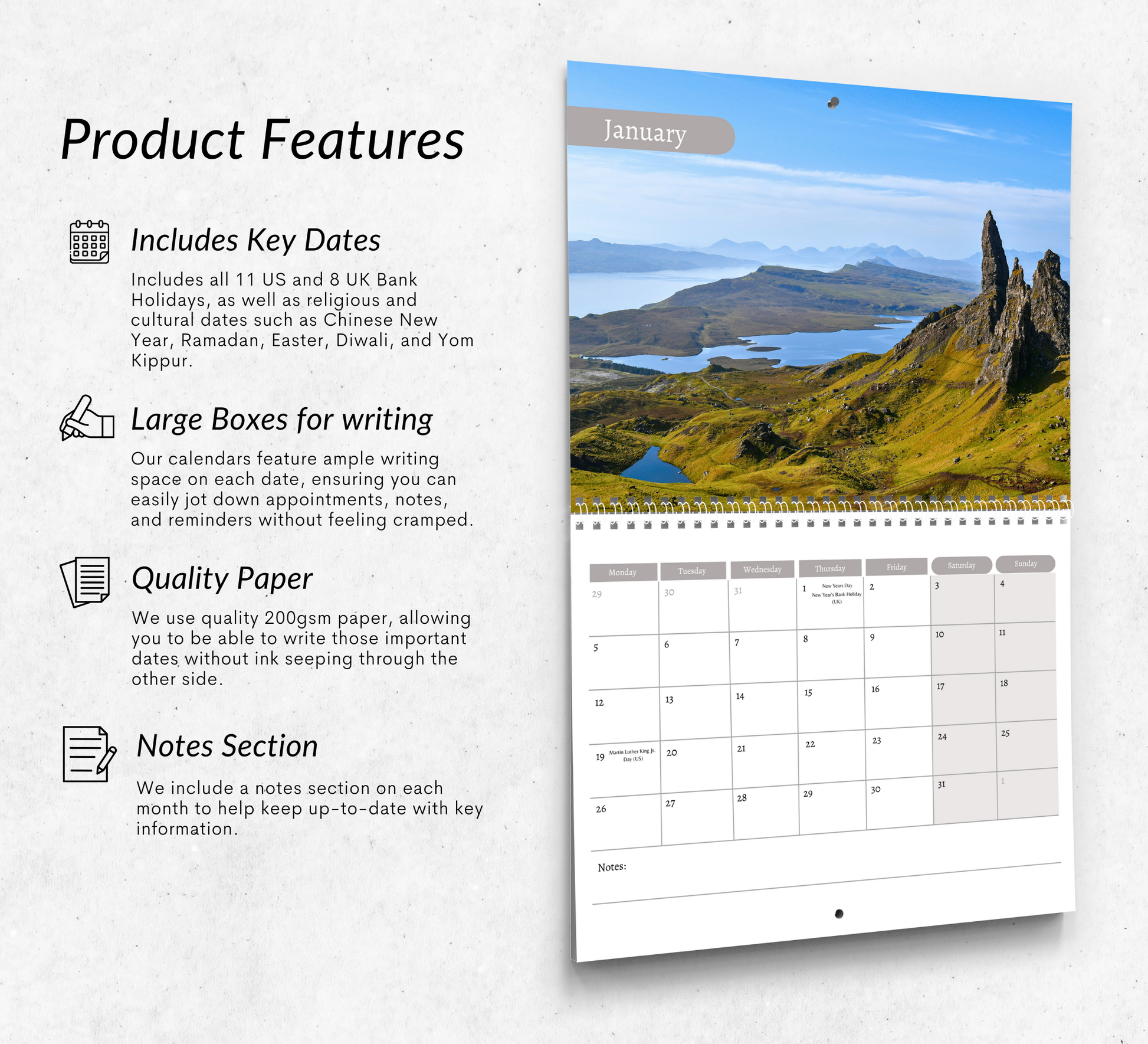 Each page features a vibrant, full-color Scotland images paired with a spacious monthly grid for notes and appointments. Brightens your kitchen, living room, office, or classroom with elegant charm.