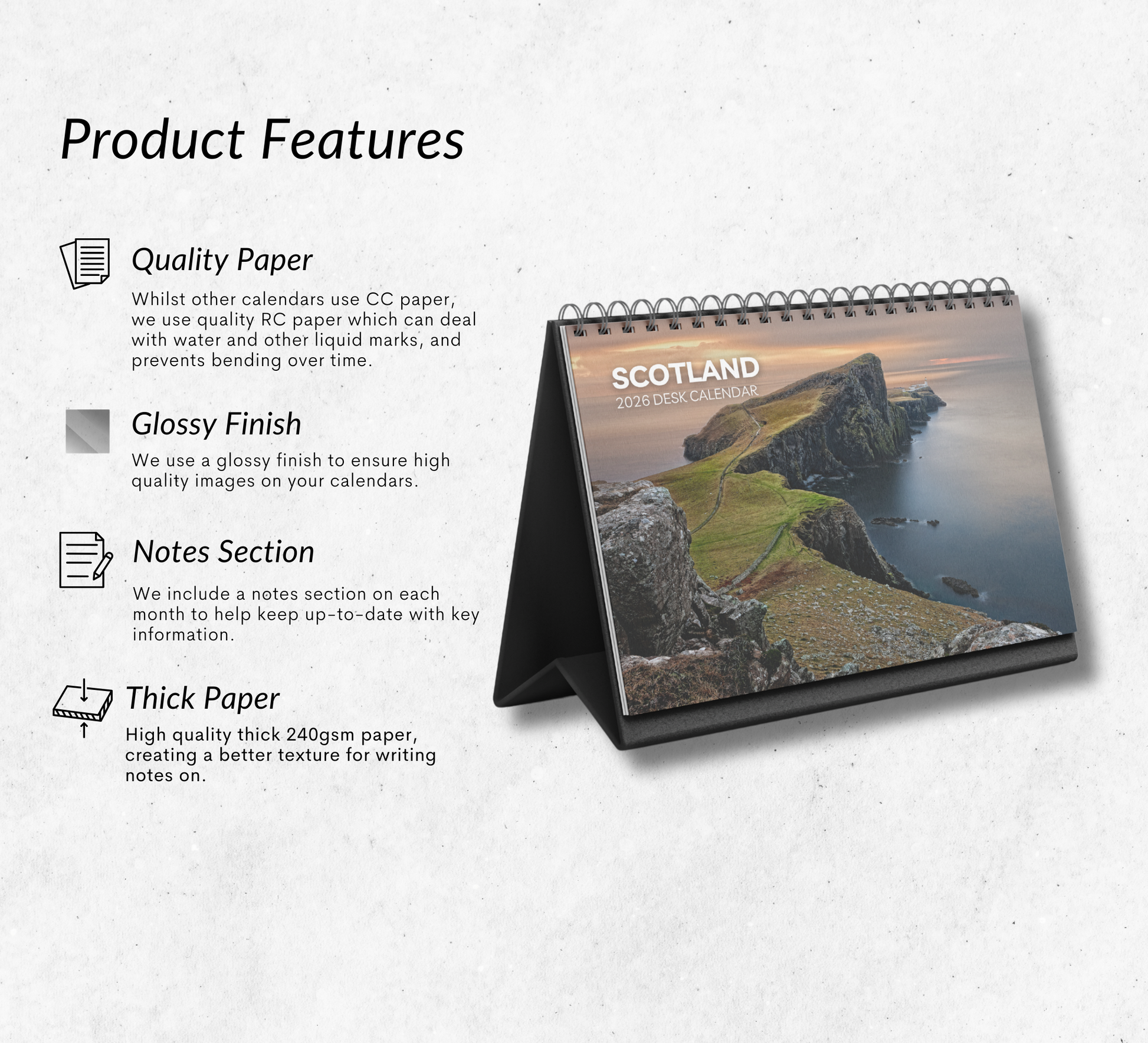 𝖢𝗋𝖺𝖿𝗍𝖾𝖽 𝖿𝗋𝗈𝗆 𝗁𝗂𝗀𝗁-𝗊𝗎𝖺𝗅𝗂𝗍𝗒, 240𝗀𝗌𝗆 𝗍𝗁𝗂𝖼𝗄 𝗉𝖺𝗉𝖾𝗋 𝗍𝗈 𝗉𝗋𝖾𝗏𝖾𝗇𝗍 𝗂𝗇𝗄 𝖻𝗅𝖾𝖾𝖽-𝗍𝗁𝗋𝗈𝗎𝗀𝗁. 𝖳𝗁𝗂𝗌 𝖼𝗁𝖺𝗋𝗆𝗂𝗇𝗀 𝖼𝖺𝗅𝖾𝗇𝖽𝖺𝗋 𝗂𝗌 𝗌𝗎𝗉𝗉𝗈𝗋𝗍𝖾𝖽 𝖻𝗒 𝖺 𝗌𝗍𝗎𝗋𝖽𝗒 𝖻𝗅𝖺𝖼𝗄 𝖻𝗈𝖺𝗋𝖽, 𝖺𝗅𝗅𝗈𝗐𝗂𝗇𝗀 𝗂𝗍 𝗍𝗈 𝗌𝗍𝖺𝗇𝖽 𝗎𝗉𝗋𝗂𝗀𝗁𝗍 𝗈𝗇 𝗒𝗈𝗎𝗋 𝖽𝖾𝗌𝗄.