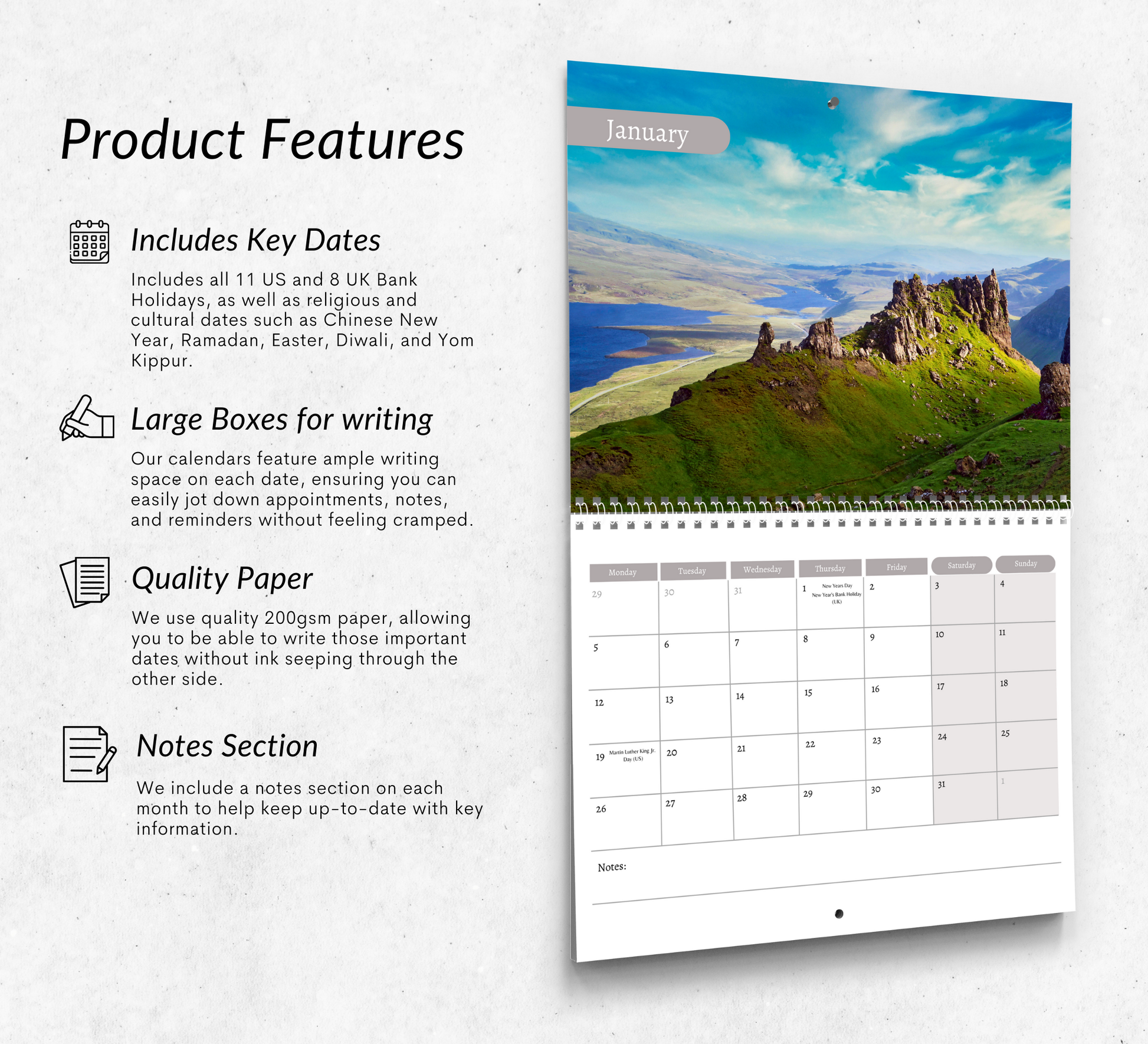 Each page features a vibrant, full-color Scottish Highlands images paired with a spacious monthly grid for notes and appointments. Brightens your kitchen, living room, office, or classroom with elegant charm.