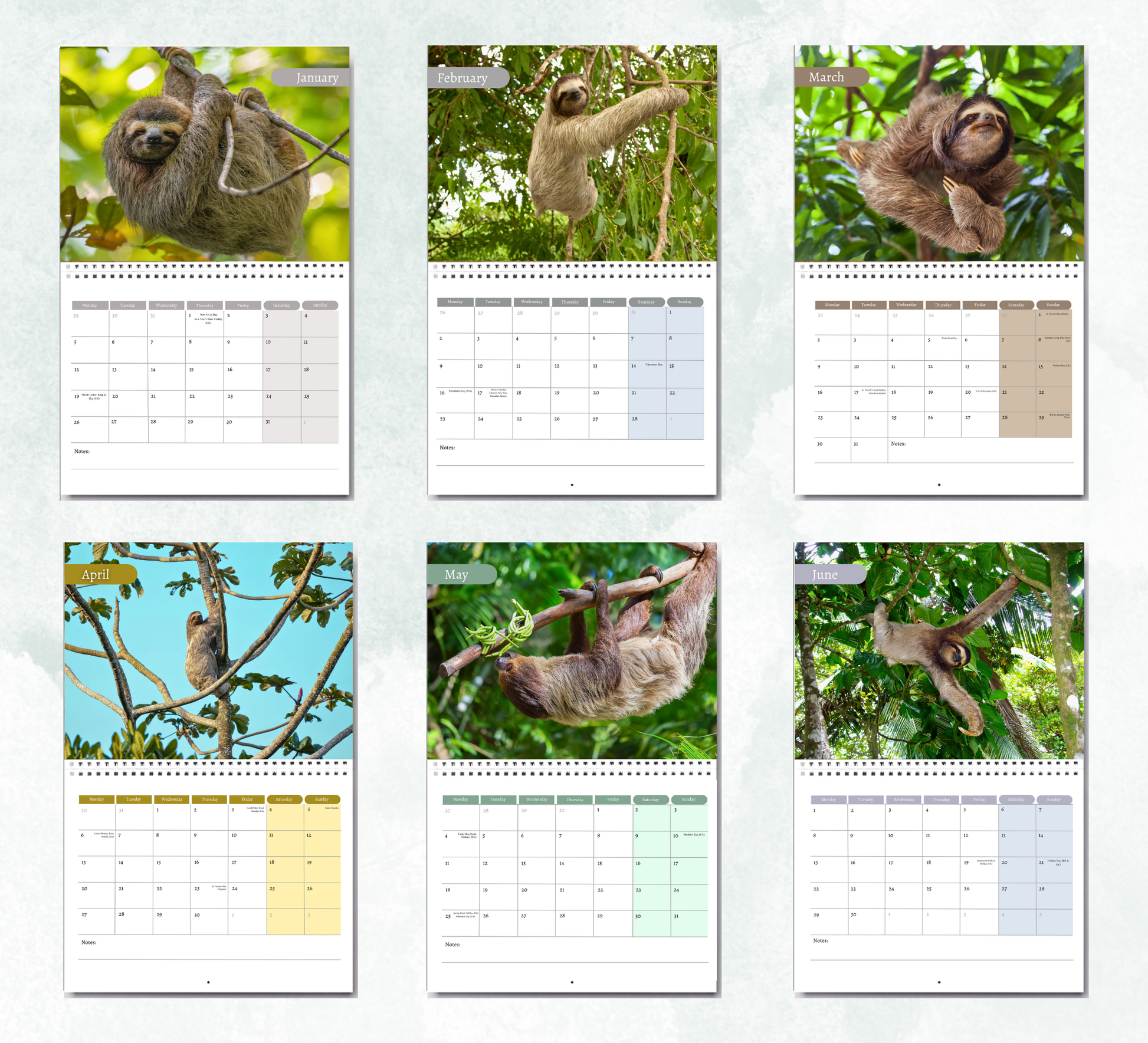 Each page features a vibrant, full-color Sloth images paired with a spacious monthly grid for notes and appointments. Brightens your kitchen, living room, office, or classroom with elegant charm.