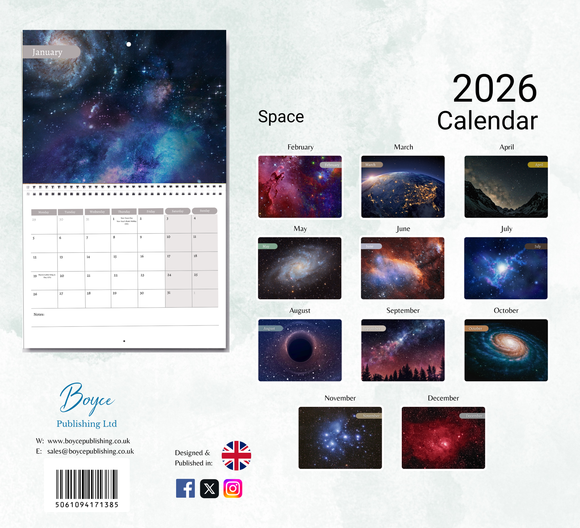 Stay organized with this beautiful 2026 Space wall calendar. (Jan–Dec 2026).