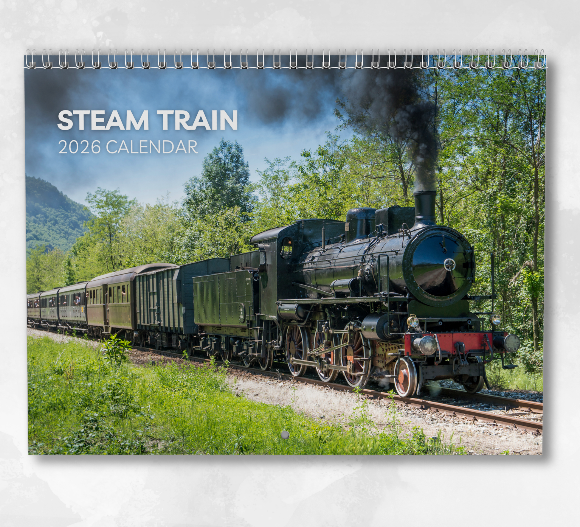 Stay organized with this beautiful 2026 Steam Train wall calendar. (Jan–Dec 2026).