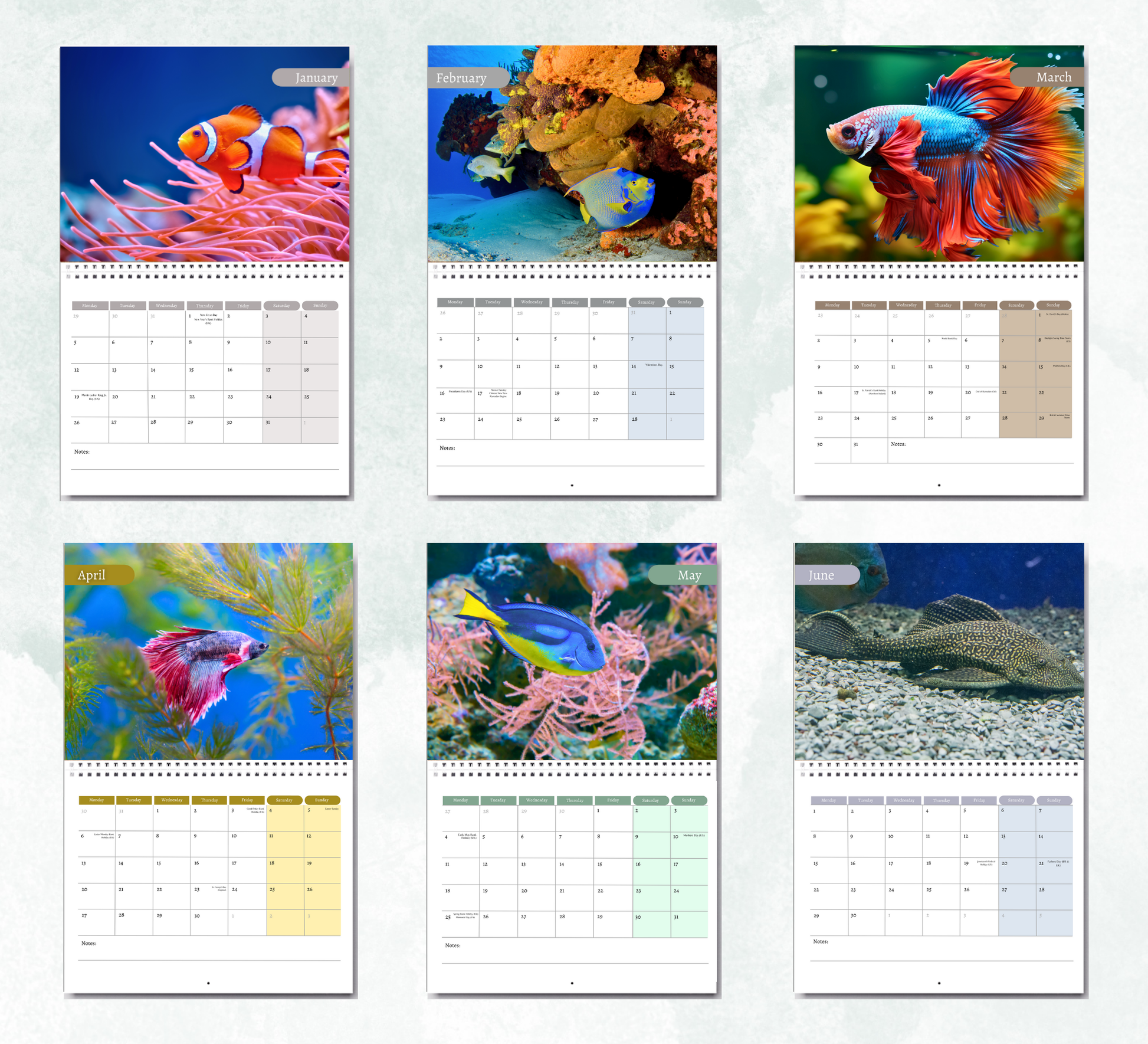 Each page features a vibrant, full-color Tropical Fish images paired with a spacious monthly grid for notes and appointments. Brightens your kitchen, living room, office, or classroom with elegant charm.