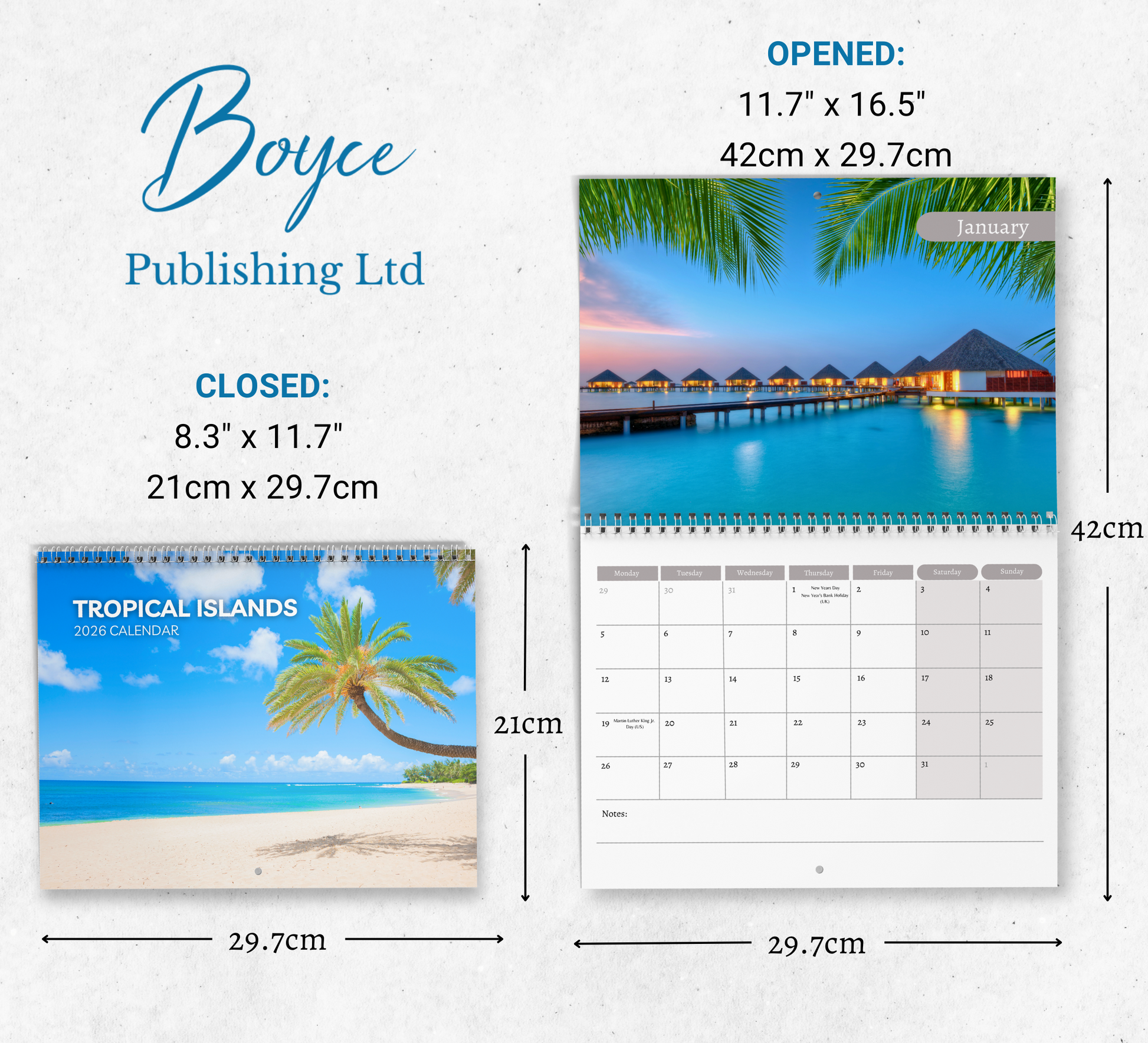 Stay organized with this beautiful 2026 Tropical Islands wall calendar. (Jan–Dec 2026).