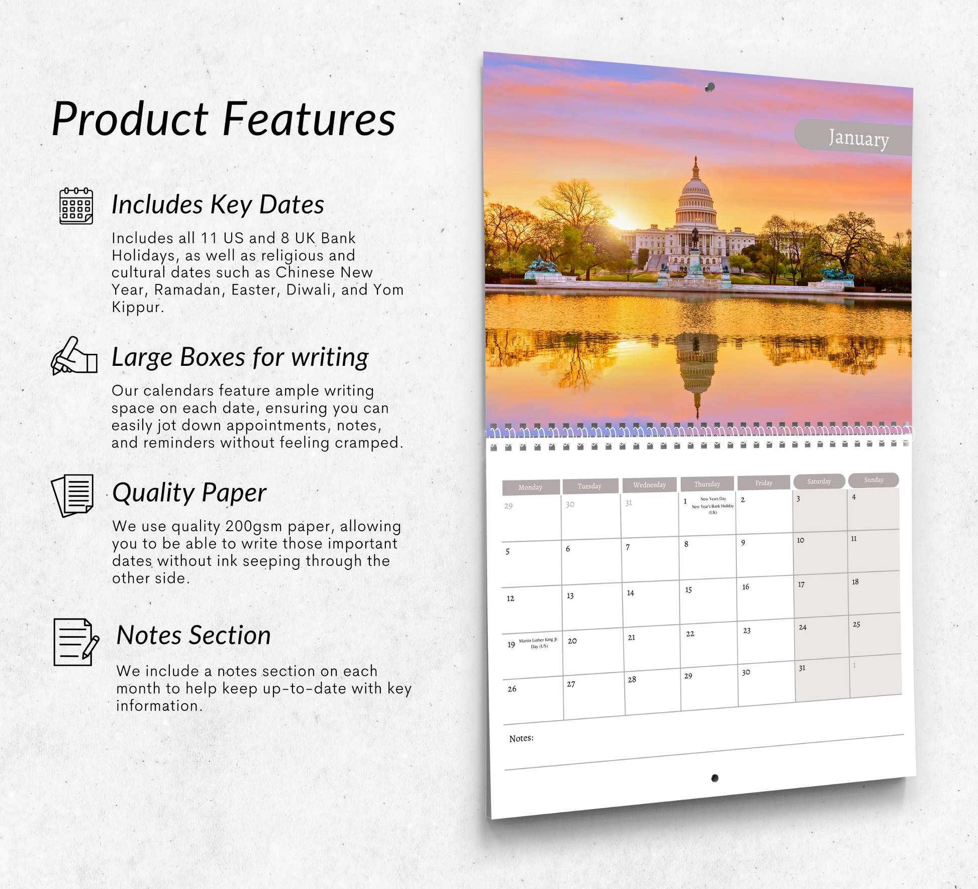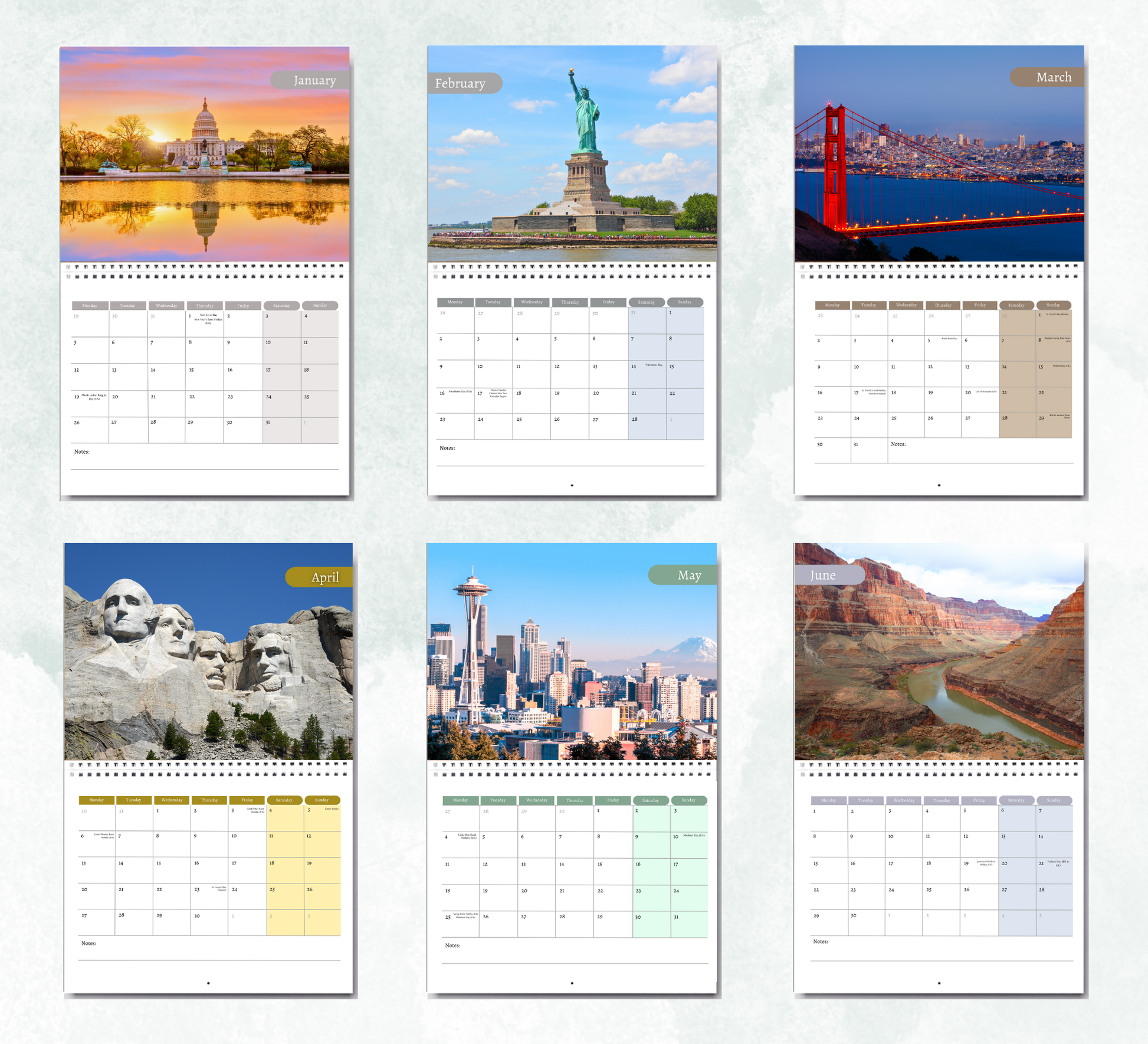 Each page features a vibrant, full-color USA images paired with a spacious monthly grid for notes and appointments. Brightens your kitchen, living room, office, or classroom with elegant charm.