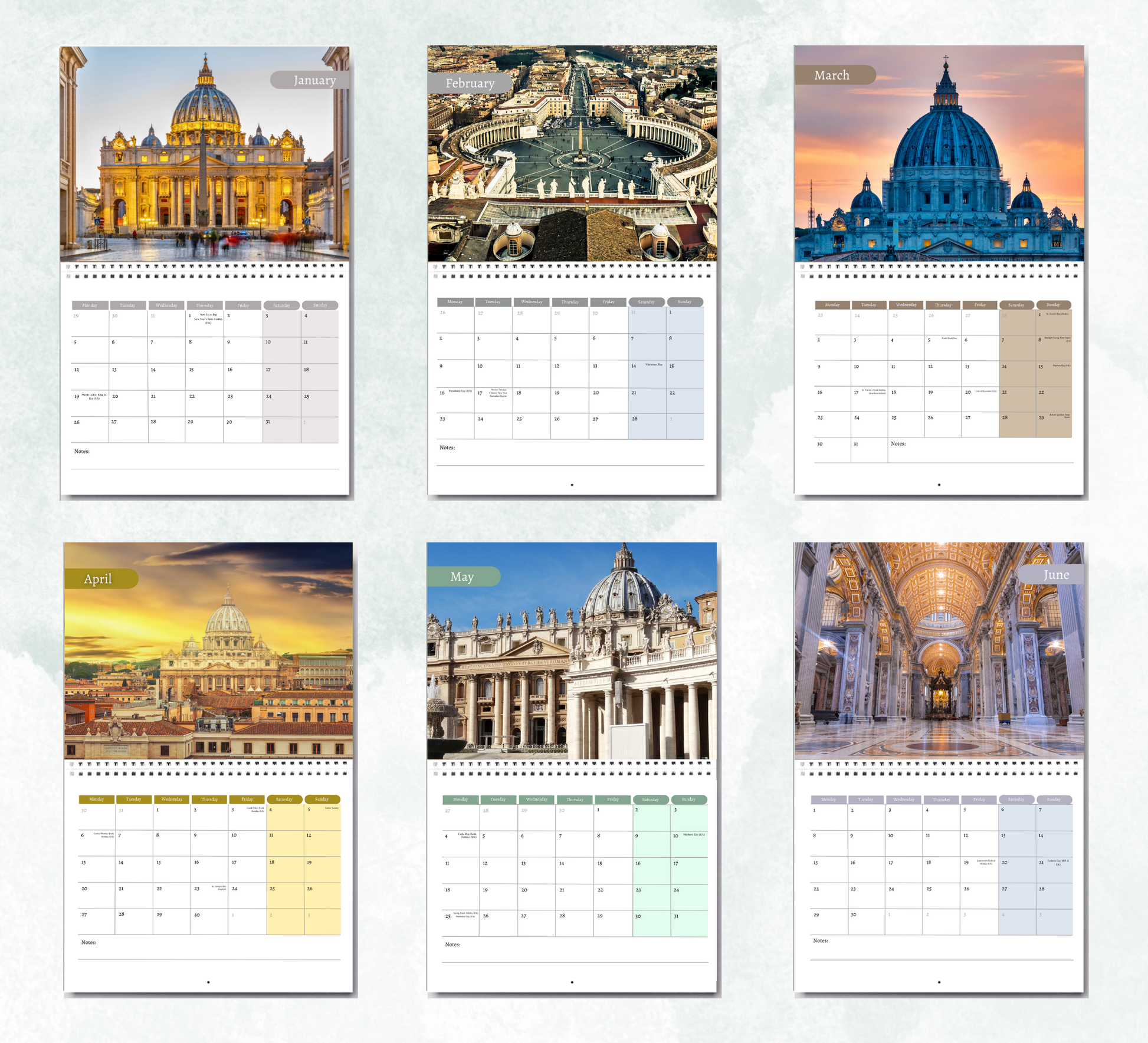 Each page features a vibrant, full-color Vatican images paired with a spacious monthly grid for notes and appointments. Brightens your kitchen, living room, office, or classroom with elegant charm.